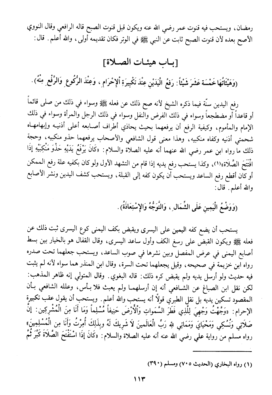 رفع الْيَدَيْنِ سنة فِيمَا ذكره الشَّيْخ لِأَنَّهُ صَحَّ عَن فعله صلى الله عَلَيْهِ وَسلم وَسَوَاء فِي ذَلِك من صلى قَائِما أَو قَاعِدا أَو مُضْطَجعا وَسَوَاء فِي ذَلِك الْفَرْض وَالنَّفْل وَسَوَاء فِي ذَلِك الرجل وَالْمَرْأَة وَسَوَاء فِي ذَلِك الإِمَام وَالْمَأْمُوم وَكَيْفِيَّة الرّفْع أَن يرفعهما بِحَيْثُ يُحَاذِي أَطْرَاف أَصَابِعه أَعلَى أُذُنَيْهِ وإبهامهاه شحمتي أُذُنَيْهِ وَكَفاهُ مَنْكِبَيْه وَهَذَا معنى قَول الشَّافِعِي وَالْأَصْحَاب يرفعهما حَذْو مَنْكِبَيْه وَحجَّة ذَلِك مَا رَوَاهُ ابْن عمر رَضِي الله عَنْهُمَا أَنه عَلَيْهِ السَّلَام