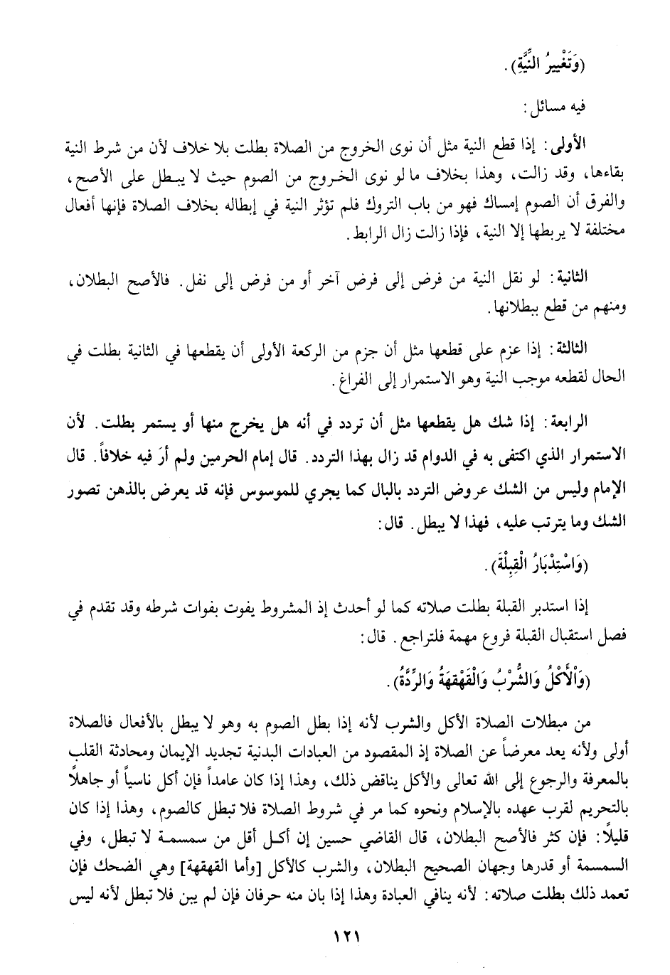 الأولى إِذا قطع النِّيَّة مثل إِن نوى الْخُرُوج من الصَّلَاة بطلت بِلَا خلاف لِأَن من شَرط النِّيَّة بقاءها وَقد زَالَت وَهَذَا بِخِلَاف مَا لَو نوى الْخُرُوج من الصَّوْم حَيْثُ لَا يبطل على الْأَصَح وَالْفرق أَن الصَّوْم إمْسَاك فَهُوَ من بَاب التروك فَلم تُؤثر النِّيَّة فِي إِبْطَاله بِخِلَاف الصَّلَاة فَإِنَّهَا أَفعَال مُخْتَلفَة لَا يربطها إِلَّا النِّيَّة فَإِذا زَالَت زَالَ الرابط
