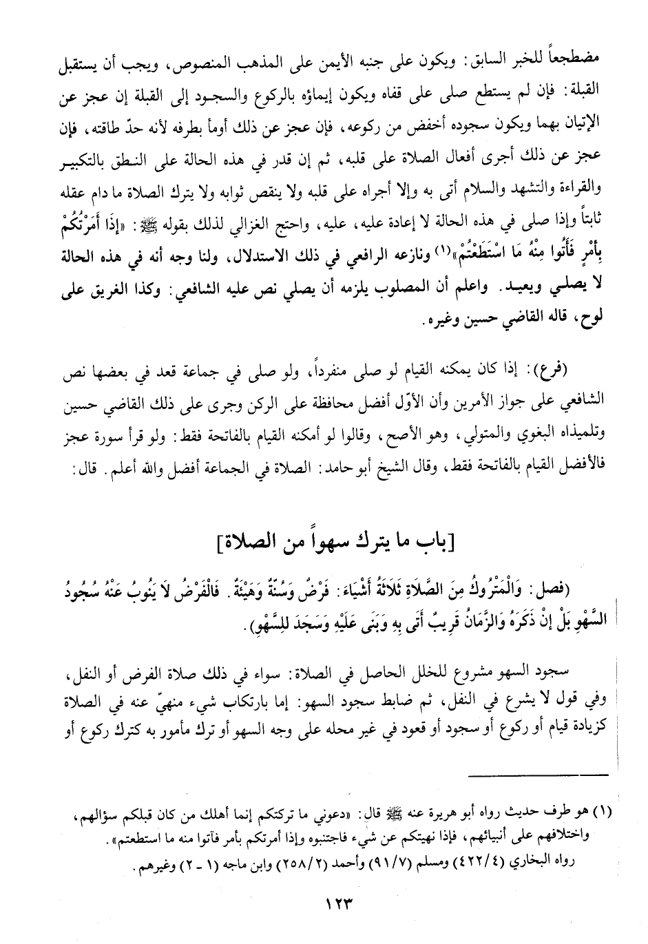 سُجُود السَّهْو مَشْرُوع للخلل الْحَاصِل فِي الصَّلَاة سَوَاء فِي ذَلِك صَلَاة الْفَرْض أَو النَّفْل وَفِي قَول لَا يشرع فِي النَّفْل ثمَّ ضَابِط سُجُود السَّهْو إِمَّا بارتكاب شَيْء مَنْهِيّ عَنهُ فِي الصَّلَاة كزيادة قيام أَو رُكُوع أَو سُجُود أَو قعُود فِي غير مَحَله على وَجه السَّهْو أَو ترك مَأْمُور بِهِ كَتَرْكِ رُكُوع أَو