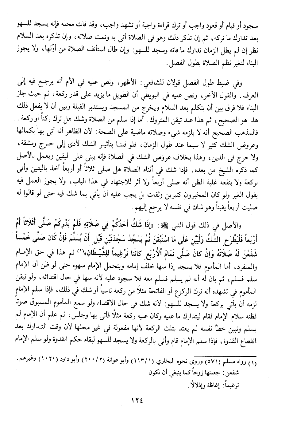 وَفِي ضبط طول الْفَصْل قَولَانِ للشَّافِعِيّ الْأَظْهر وَنَصّ عَلَيْهِ فِي الْأُم أَنه يرجع فِيهِ إِلَى الْعرف وَالْقَوْل الآخر وَنَصّ عَلَيْهِ فِي الْبُوَيْطِيّ أَن الطَّوِيل مَا يزِيد على قدر رَكْعَة ثمَّ حَيْثُ جَازَ الْبناء فَلَا فرق بَين أَن يتَكَلَّم بعد السَّلَام وَيخرج من الْمَسْجِد ويستدبر الْقبْلَة وَبَين أَن لَا يفعل ذَلِك هَذَا هُوَ الصَّحِيح ثمَّ هَذَا عِنْد تَيَقّن الْمَتْرُوك أما إِذا سلم من الصَّلَاة وَشك هَل ترك ركنا أَو رَكْعَة فَالْمَذْهَب الصَّحِيح أَنه لَا يلْزمه شَيْء وَصلَاته مَاضِيَة على الصِّحَّة لِأَن الظَّاهِر أَنه أَتَى بهَا بكمالها وعروض الشَّك كثير لَا سِيمَا عِنْد طول الزَّمَان فَلَو قُلْنَا بتأثير الشَّك لَأَدَّى إِلَى حرج ومشقة وَلَا حرج فِي الدّين وَهَذَا بِخِلَاف عرُوض الشَّك فِي الصَّلَاة فَإِنَّهُ يَبْنِي على الْيَقِين وَيعْمل بِالْأَصْلِ كَمَا ذكره الشَّيْخ من بعده فَإِذا شكّ فِي أثْنَاء الصَّلَاة هَل صلى ثَلَاثًا أَو أَرْبعا أَخذ بِالْيَقِينِ وأتى بِرَكْعَة وَلَا يَنْفَعهُ غَلَبَة الظَّن أَنه صلى أَرْبعا وَلَا أثر للإجتهاد فِي هَذَا الْبَاب وَلَا يجوز الْعَمَل فِيهِ بقول الْغَيْر وَلَو كَانَ المخبرون كثيرين وثقات بل يجب عَلَيْهِ أَن يَأْتِي بِمَا شكّ فِيهِ حَتَّى لَو قَالُوا لَهُ صليت أَرْبعا يَقِينا وَهُوَ شَاك فِي نَفسه لَا يرجع إِلَيْهِم