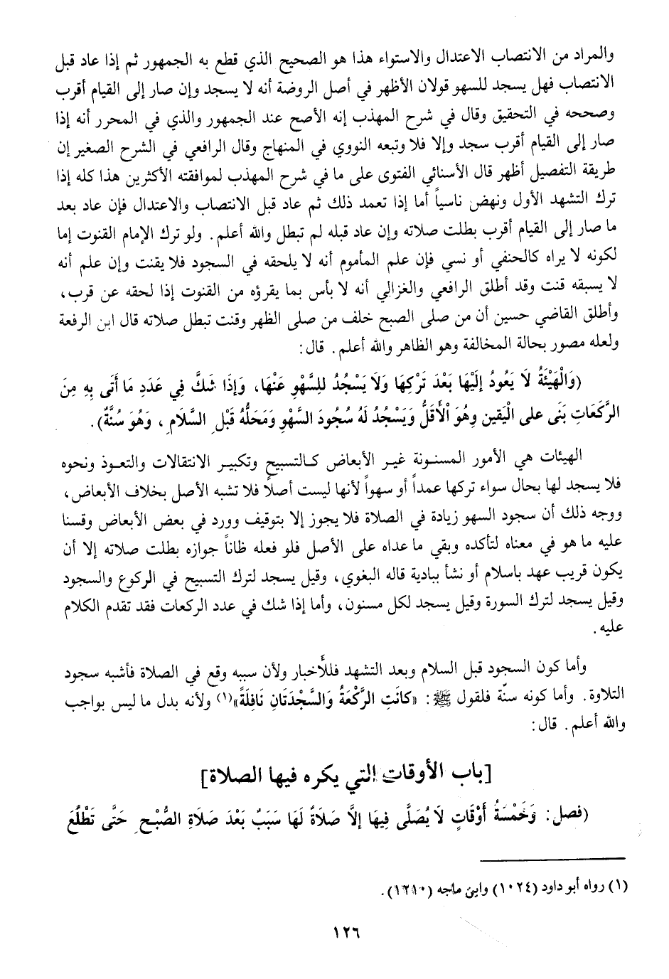 الهيئات هِيَ الْأُمُور المسنونة غير الأبعاض كالتسبيح وتكبير الِانْتِقَالَات والتعوذ وَنَحْوه فَلَا يسْجد لَهَا بِحَال سَوَاء تَركهَا عمدا أَو سَهوا لِأَنَّهَا لَيست أصلا فَلَا تشبه الأَصْل بِخِلَاف الأبعاض وَوجه ذَلِك أَن سُجُود السَّهْو زِيَادَة فِي الصَّلَاة فَلَا يجوز إِلَّا بتوقيف وَورد فِي بعض الأبعاض وقسنا عَلَيْهِ مَا هُوَ فِي مَعْنَاهُ لتأكده وَبَقِي مَا عداهُ على الأَصْل فَلَو فعله ظَانّا جَوَازه بطلت صلَاته إِلَّا أَن يكون قريب عهد باسلام أَو نَشأ ببادية قَالَه الْبَغَوِيّ وَقيل يسْجد لترك التَّسْبِيح فِي الرُّكُوع وَالسُّجُود وَقيل يسْجد لترك السُّورَة وَقيل يسْجد لكل مسنون وَأما إِذا شكّ فِي عدد الرَّكْعَات فقد تقدم الْكَلَام عَلَيْهِ