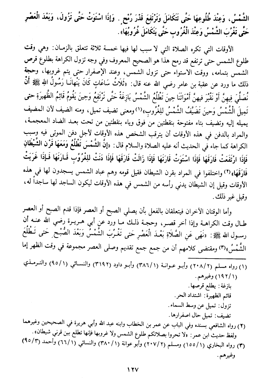الشَّمْس وَعند طُلُوعهَا حَتَّى تتكامل وترتفع قدر رمح وَإِذا اسْتَوَت حَتَّى تَزُول وَبعد الْعَصْر حَتَّى تغرب الشَّمْس وَعند الْغُرُوب حَتَّى يتكامل غُرُوبهَا)