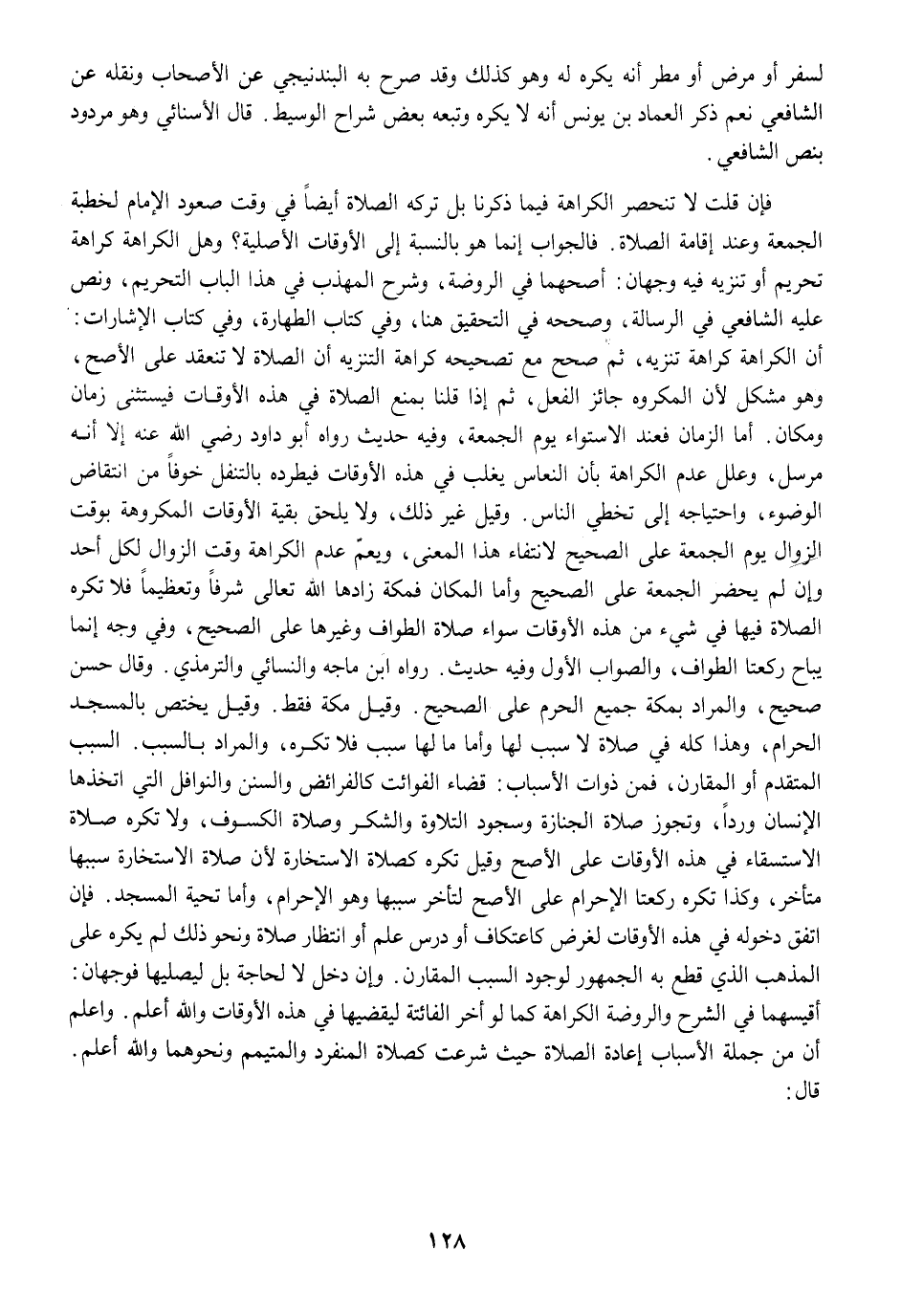 فَإِن قلت لَا تَنْحَصِر الْكَرَاهَة فِيمَا ذكرنَا بل تَركه الصَّلَاة أَيْضا فِي وَقت صعُود الإِمَام لخطبة الْجُمُعَة وَعند اقامة الصَّلَاة فَالْجَوَاب إِنَّمَا هُوَ بِالنِّسْبَةِ إِلَى الْأَوْقَات الْأَصْلِيَّة وَهل الْكَرَاهَة كَرَاهَة تَحْرِيم أَو تَنْزِيه فِيهِ وَجْهَان أصَحهمَا فِي الرَّوْضَة وَشرح الْمُهَذّب فِي هَذَا الْبَاب التَّحْرِيم وَنَصّ عَلَيْهِ الشَّافِعِي فِي الرسَالَة وَصَححهُ فِي التَّحْقِيق هُنَا وَفِي كتاب الطَّهَارَة وَفِي كتاب الاشارات أَن الْكَرَاهَة كَرَاهَة تَنْزِيه ثمَّ صحّح مَعَ تَصْحِيحه كَرَاهَة التَّنْزِيه أَن الصَّلَاة لَا تَنْعَقِد على الْأَصَح وَهُوَ مُشكل لِأَن الْمَكْرُوه جَائِز الْفِعْل ثمَّ إِذا قُلْنَا بِمَنْع الصَّلَاة فِي هَذِه الْأَوْقَات فيستثنى زمَان وَمَكَان أما الزَّمَان فَعِنْدَ الاسْتوَاء يَوْم الْجُمُعَة وَفِيه حَدِيث رَوَاهُ أَبُو دَاوُد رَضِي الله عَنهُ إِلَّا أَنه مُرْسل وَعلل عدم الْكَرَاهَة بِأَن النعاس يغلب فِي هَذِه الْأَوْقَات فيطرده بالتنفل خوفًا من انْتِقَاض الْوضُوء واحتياجه إِلَى تخطي النَّاس وَقيل غير ذَلِك وَلَا يلْحق بَقِيَّة الْأَوْقَات الْمَكْرُوهَة بِوَقْت الزَّوَال يَوْم الْجُمُعَة على الصَّحِيح لانْتِفَاء هَذَا الْمَعْنى ويعم عدم الْكَرَاهَة وَقت الزَّوَال لكل أحد وَإِن لم يحضر الْجُمُعَة على الصَّحِيح وَأما الْمَكَان فمكة زَادهَا الله تَعَالَى شرفاً وتعظيماً فَلَا تكره الصَّلَاة فِيهَا فِي شَيْء من هَذِه الْأَوْقَات سَوَاء صَلَاة الطّواف وَغَيرهَا على الصَّحِيح وَفِي وَجه إِنَّمَا يُبَاح رَكعَتَا الطّواف وَالصَّوَاب الأول وَفِيه حَدِيث رَوَاهُ ابْن مَاجَه وَالنَّسَائِيّ وَالتِّرْمِذِيّ وَقَالَ حسن صَحِيح وَالْمرَاد بِمَكَّة جَمِيع الْحرم على الصَّحِيح وَقبل مَكَّة فَقَط وَقيل يخْتَص بِالْمَسْجِدِ الْحَرَام وَهَذَا كُله فِي صَلَاة لَا سَبَب لَهَا وَأما مَا لَهَا سَبَب فَلَا تكره وَالْمرَاد بِالسَّبَبِ السَّبَب الْمُتَقَدّم أَو الْمُقَارن فَمن ذَوَات الْأَسْبَاب قَضَاء الْفَوَائِت كالفرائض وَالسّنَن والنوافل الَّتِي اتخذها الانسان وردا وَتجوز صَلَاة الْجِنَازَة وَسُجُود التِّلَاوَة وَالشُّكْر وَصَلَاة الْكُسُوف وَلَا تكره صَلَاة الاسْتِسْقَاء فِي هَذِه الْأَوْقَات على الْأَصَح وَقيل تكره كَصَلَاة الاستخارة لِأَن صَلَاة الاستخارة سَببهَا مُتَأَخّر وَكَذَا تكره رَكعَتَا الاحرام على الْأَصَح لتأخر سَببهَا وَهُوَ الاحرام وَأما تَحِيَّة الْمَسْجِد فَإِن اتّفق دُخُوله فِي هَذِه الْأَوْقَات لغَرَض كاعتكاف أَو درس علم أَو انْتِظَار صَلَاة وَنَحْو ذَلِك لم يكره على الْمَذْهَب الَّذِي قطع بِهِ الْجُمْهُور لوُجُود السَّبَب الْمُقَارن وَإِن دخل لَا لحَاجَة بل ليصليها فَوَجْهَانِ أقيسهما فِي الشَّرْح وَالرَّوْضَة الْكَرَاهَة كَمَا لَو أخر الْفَائِتَة ليقضيها فِي هَذِه الْأَوْقَات وَالله أعلم وَاعْلَم أَن من جملَة الْأَسْبَاب إِعَادَة الصَّلَاة حَيْثُ شرعت كَصَلَاة الْمُنْفَرد والمتيمم وَنَحْوهمَا وَالله أعلم قَالَ
