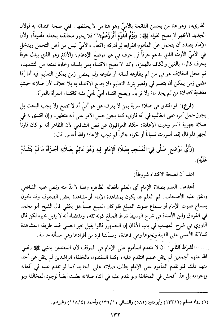 (يؤم الْقَوْم أقرؤهم) فَلَا يجوز مُخَالفَته بجعلهه مَأْمُوما وَلِأَن الامام بصدد أَن يتَحَمَّل عَن الْمَأْمُوم الْقِرَاءَة لَو أدْركهُ رَاكِعا والأمي لَيْسَ من أهل التَّحَمُّل وَيدخل فِي الْأُمِّي الْأَرَت الَّذِي يدغم حرفا فِي حرف فِي غير مَوضِع الادغام والألثغ وَهُوَ الَّذِي يُبدل حرفا بِحرف كالراء بالغين وَالْكَاف بِالْهَمْزَةِ وَكَذَا لَا يَصح الِاقْتِدَاء بِمن بِلِسَانِهِ رخاوة تَمنعهُ من التَّشْدِيد ثمَّ مَحل الْخلاف هُوَ فِي من لم يطاوعه لِسَانه أَو طاوعه وَلم يمض زمن يُمكن التَّعَلُّم فِيهِ أما إِذا مضى زمن يُمكن أَن يتَعَلَّم فِي وَقصر بترك التَّعْلِيم فَلَا يَصح الِاقْتِدَاء بِهِ بِلَا خلاف لِأَن صلَاته حِينَئِذٍ مقضية كَصَلَاة من لم يجد مَاء وَلَا تُرَابا وَيصِح اقْتِدَاء أُمِّي بأمي مثله كاقتداء الْمَرْأَة بِالْمَرْأَةِ