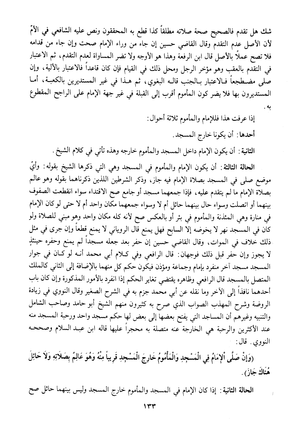 الْحَالة الثَّالِثَة أَن يكون الامام وَالْمَأْمُوم فِي الْمَسْجِد وَهِي الَّتِي ذكرهَا الشَّيْخ بقوله وَأي مَوضِع صلى فِي الْمَسْجِد بِصَلَاة الامام فِيهِ جَازَ وَذكر الشَّرْطَيْنِ اللَّذين ذكرناهما بقوله وَهُوَ عَالم بِصَلَاة الامام مَا لم يتَقَدَّم عَلَيْهِ فَإِذا جَمعهمَا مَسْجِد أَو جَامع صَحَّ الِاقْتِدَاء سَوَاء انْقَطَعت الصُّفُوف بَينهمَا أَو اتَّصَلت وَسَوَاء حَال بَينهمَا حَائِل أم لَا وَسَوَاء جَمعهمَا مَكَان وَاحِد أم لَا حَتَّى لَو كَانَ الامام فِي مَنَارَة وَهِي المئذنة وَالْمَأْمُوم فِي بِئْر أَو بِالْعَكْسِ صَحَّ لِأَنَّهُ كُله مَكَان وَاحِد وَهُوَ مبْنى للصَّلَاة وَلَو كَانَ فِي الْمَسْجِد نهر لَا يخوضه إِلَّا السابح فَهَل يمْنَع قَالَ الرَّوْيَانِيّ لَا يمْنَع قطعا وَإِن جرى فِي مثل ذَلِك خلاف فِي الْموَات وَقَالَ القَاضِي حُسَيْن إِن حفر بعد جعله مَسْجِدا لم يمْنَع وحفره حِينَئِذٍ لَا يجوز وَإِن حفر قبل ذَلِك فَوَجْهَانِ قَالَ الرَّافِعِيّ وَفِي كَلَام أبي مُحَمَّد أَنه لَو كَانَ فِي جوَار الْمَسْجِد مَسْجِد آخر مُنْفَرد بامام وَجَمَاعَة ومؤذن فَيكون حكم كل مِنْهُمَا بِالْإِضَافَة إِلَى الثَّانِي كالملك الْمُتَّصِل بِالْمَسْجِدِ قَالَ الرَّافِعِيّ وَظَاهره يَقْتَضِي تغاير الحكم إِذا انْفَرد بالأمور الْمَذْكُورَة وَإِن كَانَ بَاب أَحدهمَا نَافِذا إِلَى الآخر وَمَا نَقله عَن أبي مُحَمَّد جزم بِهِ فِي الشَّرْح الصَّغِير وَقَالَ النَّوَوِيّ فِي زِيَادَة الرَّوْضَة وَشرح الْمُهَذّب الصَّوَاب الَّذِي صرح بِهِ كَثِيرُونَ مِنْهُم الشَّيْخ أَبُو حَامِد وَصَاحب الشَّامِل والتنبيه وَغَيرهم أَن الْمَسَاجِد الَّتِي يفتح بَعْضهَا إِلَى بعض لَهَا حكم مَسْجِد وَاحِد ورحبة الْمَسْجِد مِنْهُ عِنْد الْأَكْثَرين والرحبة هِيَ الْخَارِجَة عَنهُ مُتَّصِلَة بِهِ محجراً عَلَيْهَا قَالَه ابْن عبد السَّلَام وَصَححهُ النَّوَوِيّ قَالَ