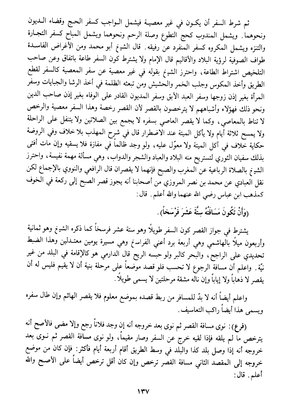 ثمَّ شَرط السّفر أَن يكون فِي غير مَعْصِيّة فَيشْمَل الْوَاجِب كسفر الْحَج وَقَضَاء الدُّيُون وَنَحْوهمَا ويشمل الْمَنْدُوب كحج التَّطَوُّع وصلَة الرَّحِم وَنَحْوهمَا ويشمل الْمُبَاح كسفر التِّجَارَة والتنزه ويشمل الْمَكْرُوه كسفر الْمُنْفَرد عَن رَفِيقه قَالَ الشَّيْخ أَبُو مُحَمَّد وَمن الْأَغْرَاض الْفَاسِدَة طواف الصُّوفِيَّة لرؤية الْبِلَاد والأقاليم قَالَ الإِمَام وَلَا يشْتَرط كَون السّفر طَاعَة بِاتِّفَاق وَعَن صَاحب التَّلْخِيص اشْتِرَاط الطَّاعَة وَاحْترز الشَّيْخ بقوله فِي غير مَعْصِيّة عَن سفر الْمعْصِيَة كالسفر لقطع الطَّرِيق وَأخذ المكوس وجلب الْخمر والحشيش وَمن تبعثه الظلمَة فِي أَخذ الرشا والجبايات وسفر الْمَرْأَة بِغَيْر إِذن زَوجهَا وسفر العَبْد الْآبِق وسفر الْمَدْيُون الْقَادِر على الْوَفَاء بِغَيْر إِذن صَاحب الدّين وَنَحْو ذَلِك فَهَؤُلَاءِ وأشباههم لَا يترخصون بِالْقصرِ لِأَن الْقصر رخصَة وَهَذَا السّفر مَعْصِيّة والرخص لَا تناط بِالْمَعَاصِي وكما لَا يقصر العَاصِي بِسَفَرِهِ لَا يجمع بَين الصَّلَاتَيْنِ وَلَا يتَنَفَّل على الرَّاحِلَة وَلَا يمسح ثَلَاثَة أَيَّام وَلَا يَأْكُل الْميتَة عِنْد الِاضْطِرَار قَالَ فِي شرح الْمُهَذّب بِلَا خلاف وَفِي الرَّوْضَة حِكَايَة خلاف فِي أكل الْميتَة وَلَا معول عَلَيْهِ وَلَو وجد ظَالِما فِي مفازة فَلَا يسْقِيه وَإِن مَاتَ أفتى بذلك سُفْيَان الثَّوْريّ لتستريح مِنْهُ الْبِلَاد والعباد وَالشَّجر وَالدَّوَاب وَهُوَ مَسْأَلَة مهمة نفيسة وَاحْترز الشَّيْخ بِالصَّلَاةِ الرّبَاعِيّة عَن الْمغرب وَالصُّبْح فَإِنَّهُمَا لَا يقصران قَالَ الرَّافِعِيّ وَالنَّوَوِيّ بِالْإِجْمَاع لَكِن نقل الْعَبَّادِيّ عَن مُحَمَّد بن نصر الْمروزِي من أَصْحَابنَا أَنه يجوز قصر الصُّبْح إِلَى رَكْعَة فِي الْخَوْف كمذهب ابْن عَبَّاس رَضِي الله عَنْهُمَا وَالله أعلم قَالَ