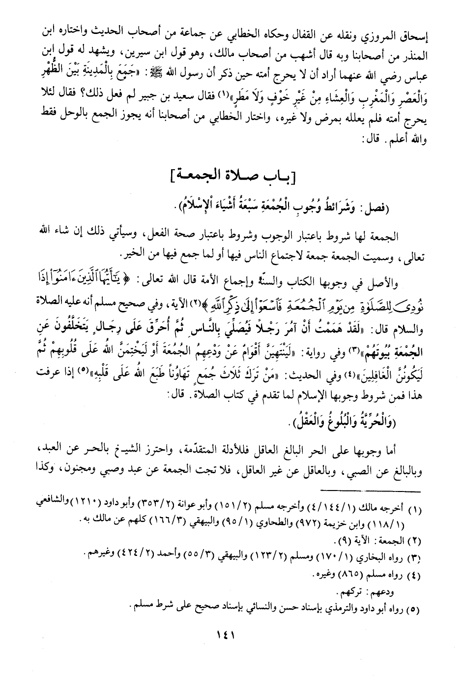 الْجُمُعَة لَهَا شُرُوط بِاعْتِبَار الْوُجُوب وشروط بِاعْتِبَار صِحَة الْفِعْل وَسَيَأْتِي ذَلِك إِن شَاءَ الله تَعَالَى وَسميت الْجُمُعَة جُمُعَة لِاجْتِمَاع النَّاس فِيهَا أَو لما جمع فِيهَا من الْخَيْر
