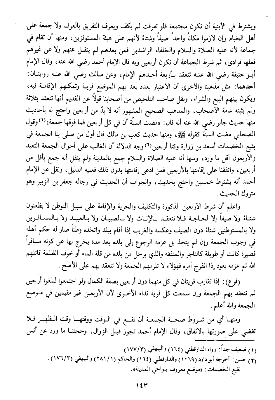 (مَضَت السّنة أَن فِي كل أَرْبَعِينَ فَمَا فَوْقهَا جُمُعَة) وَقَول الصَّحَابِيّ مَضَت السّنة كَقَوْلِه صلى الله عَلَيْهِ وَسلم وَمِنْهَا حَدِيث كَعْب بن مَالك قَالَ أول من صلى بِنَا الْجُمُعَة فِي بَقِيع الْخضمات أسعد بن زُرَارَة وَكُنَّا أَرْبَعِينَ وَجه الدّلَالَة أَن الْغَالِب على أَحْوَال الْجُمُعَة التَّعَبُّد وَالْأَرْبَعُونَ أقل مَا ورد وَمِنْهَا أَنه عَلَيْهِ الصَّلَاة وَالسَّلَام جمع بِالْمَدِينَةِ وَلم ينْقل أَنه جمع بِأَقَلّ من أَرْبَعِينَ واتفقنا على اقامتها بالأربعين فَمن ادّعى إِقَامَتهَا بِدُونِ ذَلِك فَعَلَيهِ الدَّلِيل وَنقل عَن الإِمَام أَحْمد أَنه يشْتَرط خمسين وَاحْتج بِحَدِيث وَالْجَوَاب أَن الحَدِيث فِي رِجَاله جَعْفَر بن الزبير وَهُوَ مَتْرُوك الحَدِيث