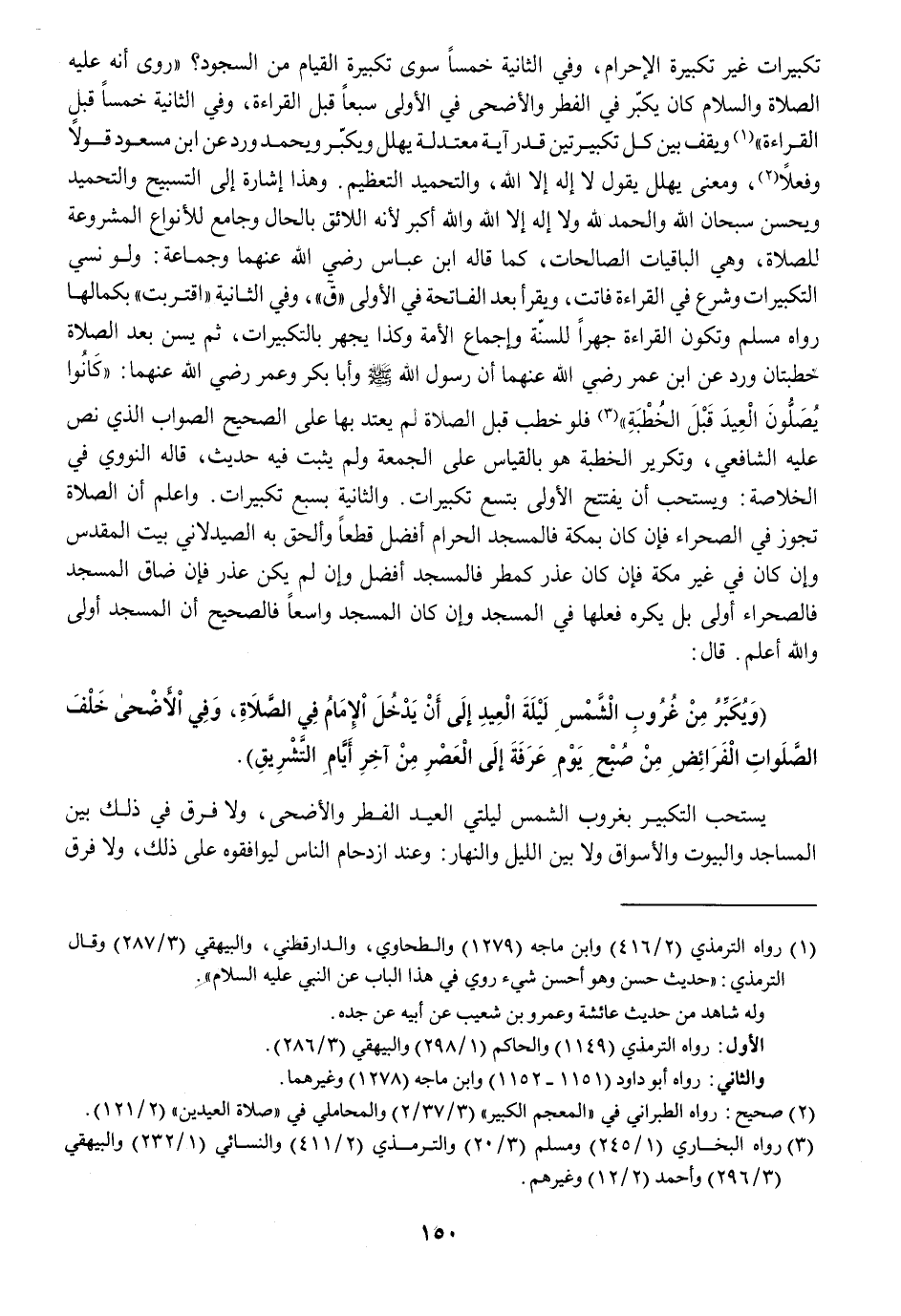 (رُوِيَ أَنه عَلَيْهِ الصَّلَاة وَالسَّلَام كَانَ يكبر فِي الْفطر والأضحى فِي الأولى سبعا قبل الْقِرَاءَة وَفِي الثَّانِيَة خمْسا قبل الْقِرَاءَة) وَيقف بَين كل تكبيرتين قدر آيَة معتلة يهلل وَيكبر ويحمد ورد عَن ابْن مَسْعُود قولا وفعلاً وَمعنى يهلل يَقُول لَا إِلَه إِلَّا الله والتحميد التَّعْظِيم وَهَذَا إِشَارَة إِلَى التَّسْبِيح والتحميد وَيحسن سُبْحَانَ الله وَالْحَمْد لله وَلَا إِلَه إِلَّا الله وَالله أكبر لِأَنَّهُ اللَّائِق بِالْحَال وجامع للأنواع الْمَشْرُوعَة للصَّلَاة وَهِي الْبَاقِيَات الصَّالِحَات كَمَا قَالَه ابْن عَبَّاس رَضِي الله عَنْهُمَا وَجَمَاعَة وَلَو نسي التَّكْبِيرَات وَشرع فِي الْقِرَاءَة فَاتَت وَيقْرَأ بعد الْفَاتِحَة فِي الأولى ق وَفِي الثَّانِيَة اقْتَرَبت بكمالها رَوَاهُ مُسلم وَتَكون الْقِرَاءَة جَهرا للسّنة وَإِجْمَاع الْأمة وَكَذَا يجْهر بالتكبيرات ثمَّ يسن بعد الصَّلَاة خطبتان ورد عَن ابْن عمر رَضِي الله عَنْهُمَا أَن رَسُول الله صلى الله عَلَيْهِ وَسلم وَأَبا بكر وَعمر رَضِي الله عَنْهُمَا