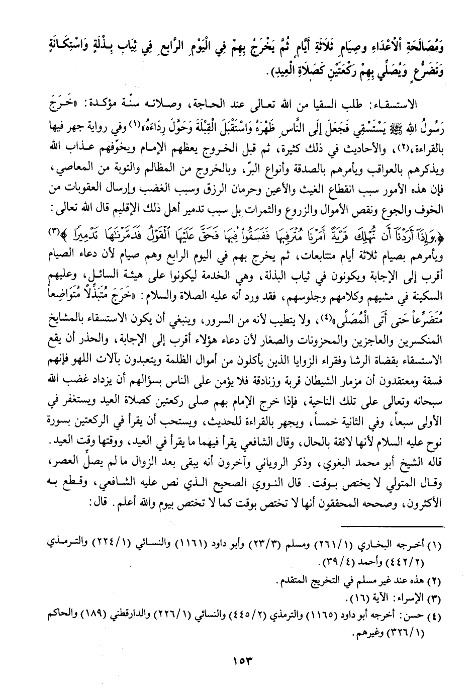 وَمُصَالَحَة الْأَعْدَاء وَصِيَام ثَلَاثَة أَيَّام ثمَّ يخرج بهم فِي الْيَوْم الرَّابِع فِي ثِيَاب بذلة واستكانة وتضرع وَيُصلي بهم رَكْعَتَيْنِ كَصَلَاة الْعِيد) الاسْتِسْقَاء طلب السقيا من الله تَعَالَى عِنْد الْحَاجة وَصلَاته سنة مُؤَكدَة