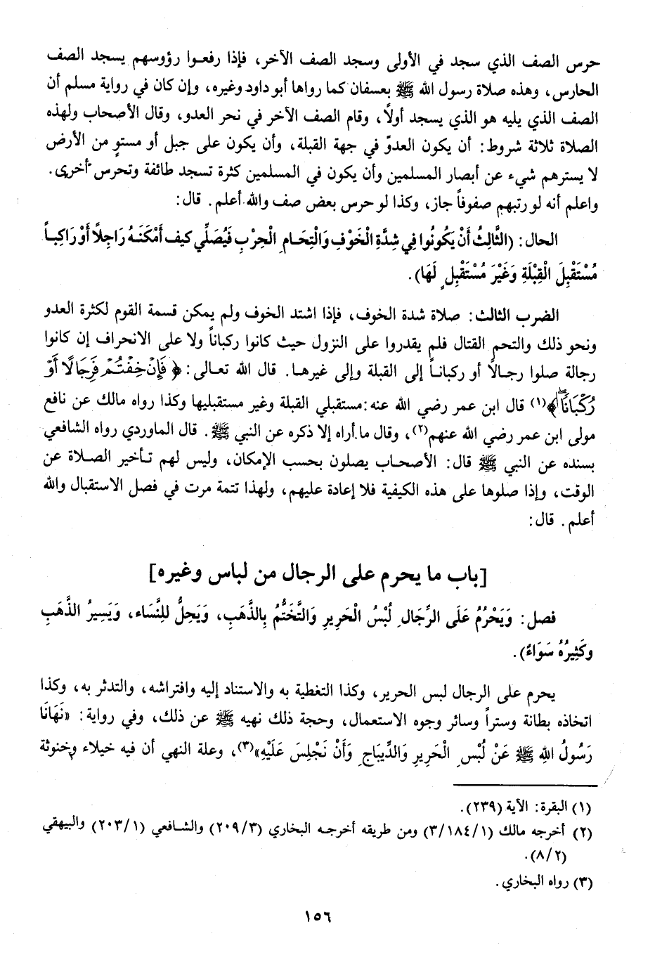 يحرم على الرِّجَال لبس الْحَرِير وَكَذَا التغطية بِهِ والاستناد إِلَيْهِ وافتراشه والتدثر بِهِ وَكَذَا اتِّخَاذه بطانة وستراً وَسَائِر وُجُوه الِاسْتِعْمَال وَحجَّة ذَلِك نَهْيه صلى الله عَلَيْهِ وَسلم عَن ذَلِك وَفِي رِوَايَة