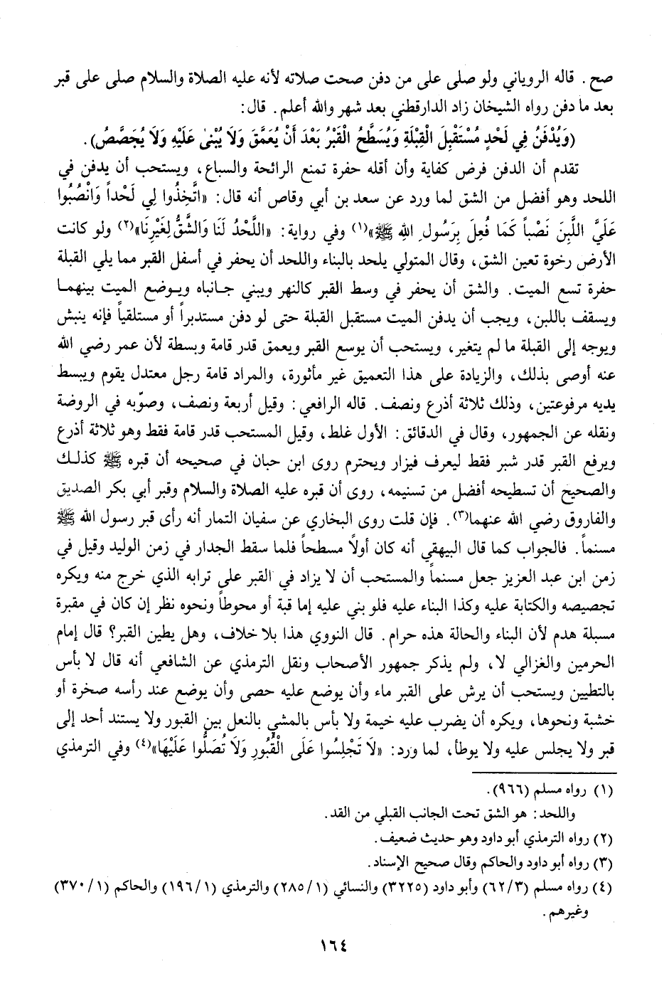 (اللَّحْد لنا والشق لغيرنا) وَلَو كَانَت الأَرْض رخوة تعين الشق وَقَالَ الْمُتَوَلِي يلْحد بِالْبِنَاءِ واللحد أَن يحْفر فِي أَسْفَل الْقَبْر مِمَّا يَلِي الْقبْلَة حُفْرَة تسع الْمَيِّت والشق أَن يحْفر فِي وسط الْقَبْر كالنهر ويبنى جانباه وَيُوضَع الْمَيِّت بَينهمَا ويسقف بِاللَّبنِ وَيجب أَن يدْفن الْمَيِّت مُسْتَقْبل الْقبْلَة حَتَّى لَو دفن مستدبراً أَو مُسْتَلْقِيا فَإِنَّهُ ينبش وَيُوجه إِلَى الْقبْلَة مَا لم يتَغَيَّر وَيسْتَحب أَن يُوسع الْقَبْر ويعمق قدر قامة وبسطة لِأَن عمر رَضِي الله عَنهُ أوصى بذلك وَالزِّيَادَة على هَذَا التعميق غير مأثورة وَالْمرَاد قامة رجل معتدل يقوم ويبسط يَدَيْهِ مرفوعتين وَذَلِكَ ثَلَاثَة أَذْرع وَنصف قَالَه الرَّافِعِيّ وَقيل أَرْبَعَة وَنصف وَصَوَّبَهُ فِي الرَّوْضَة وَنَقله عَن الْجُمْهُور وَقَالَ فِي الدقائق الأول غلط وَقيل الْمُسْتَحبّ قدر قامة فَقَط وَهُوَ ثَلَاثَة أَذْرع وَيرْفَع الْقَبْر قدر شبر فَقَط ليعرف فيزار ويحترم روى ابْن حبَان فِي صَحِيحه أَن قبر صلى الله عَلَيْهِ وَسلم كَذَلِك وَالصَّحِيح أَن تسطيحه أفضل من تسنيمه رُوِيَ أَن قَبره عَلَيْهِ الصَّلَاة وَالسَّلَام وقبر أبي بكر الصّديق والفاروق رَضِي الله عَنْهُمَا فَإِن قلت روى البُخَارِيّ عَن سُفْيَان التمار أَنه رأى قبر رَسُول الله صلى الله عَلَيْهِ وَسلم مسنماً فَالْجَوَاب كَمَا قَالَه الْبَيْهَقِيّ أَنه كَانَ أَولا مسطحًا فَلَمَّا سقط الْجِدَار فِي زمن الْوَلِيد وَقيل فِي زمن ابْن عبد الْعَزِيز جعل مسنما وَالْمُسْتَحب أَن لَا يُزَاد فِي الْقَبْر على ترابه الَّذِي خرج مِنْهُ وَيكرهُ تجصيصه وَالْكِتَابَة عَلَيْهِ وَكَذَا الْبناء عَلَيْهِ فَلَو بنى عَلَيْهِ إِمَّا قبَّة أَو محوطاً وَنَحْوه نظر إِن كَانَ فِي مَقْبرَة مسْلبَةٌ هدم لِأَن الْبناء وَالْحَالة هَذِه حرَام قَالَ النَّوَوِيّ هَذَا بِلَا خلاف وَهل يطين الْقَبْر قَالَ إِمَام الْحَرَمَيْنِ وَالْغَزالِيّ لَا وَلم يذكر جُمْهُور الْأَصْحَاب وَنقل التِّرْمِذِيّ عَن الشَّافِعِي أَنه قَالَ لَا بَأْس بالتطيين وَيسْتَحب أَن يرش على الْقَبْر مَاء وَأَن يوضع عَلَيْهِ حَصى وَأَن يوضع عِنْد رَأسه صَخْرَة أَو خَشَبَة وَنَحْوهَا وَيكرهُ أَن يضْرب عَلَيْهِ خيمة وَلَا بَأْس بِالْمَشْيِ بالنعل بَين الْقُبُور وَلَا يسْتَند أحد إِلَى قبر وَلَا يجلس عَلَيْهِ وَلَا يُوطأ لما ورد