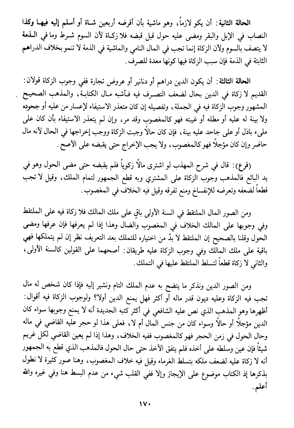 وَمن صور الدّين وَنَذْكُر مَا يَتَّضِح بِهِ عدم الْملك التَّام ونشير إِلَيْهِ فَإِذا كَانَ شخص لَهُ مَال تجب فِيهِ الزَّكَاة وَعَلِيهِ دُيُون قدر مَاله أَو أَكثر فَهَل يمْنَع الدّين أَو لَا ولوجوب الزَّكَاة فِيهِ أَقْوَال أظهرها وَهُوَ الْمَذْهَب الَّذِي نَص عَلَيْهِ الشَّافِعِي فِي أَكثر كتبه الجديدة أَنه لَا يمْنَع وُجُوبهَا سَوَاء كَانَ الدّين مُؤَجّلا أَو حَالا وَسَوَاء كَانَ من جنس المَال أم لَا فعلى هَذَا لَو حجر عَلَيْهِ القَاضِي فِي مَاله وَحَال الْحول فِي الزَّمن الْحجر فَهُوَ كالمغصوب فَفِيهِ الْخلاف وَهَذَا إِذا لم يعين القَاضِي لكل غَرِيم شَيْئا فَإِن عين وسلطه على أَخذه فَلم يتَّفق الْآخِذ حَتَّى حَال الْحول فَالْمَذْهَب الَّذِي قطع بِهِ الْجُمْهُور أَنه لَا زَكَاة عَلَيْهِ لضعف ملكه بتسلط الْغُرَمَاء وَقيل فِيهِ خلاف الْمَغْصُوب وَهنا صور كَثِيرَة لَا نطول بذكرها إِذْ الْكتاب مَوْضُوع على افيجاز وَإِلَّا فَفِي الْقلب شَيْء من عدم الْبسط هُنَا وَفِي غَيره وَالله أعلم