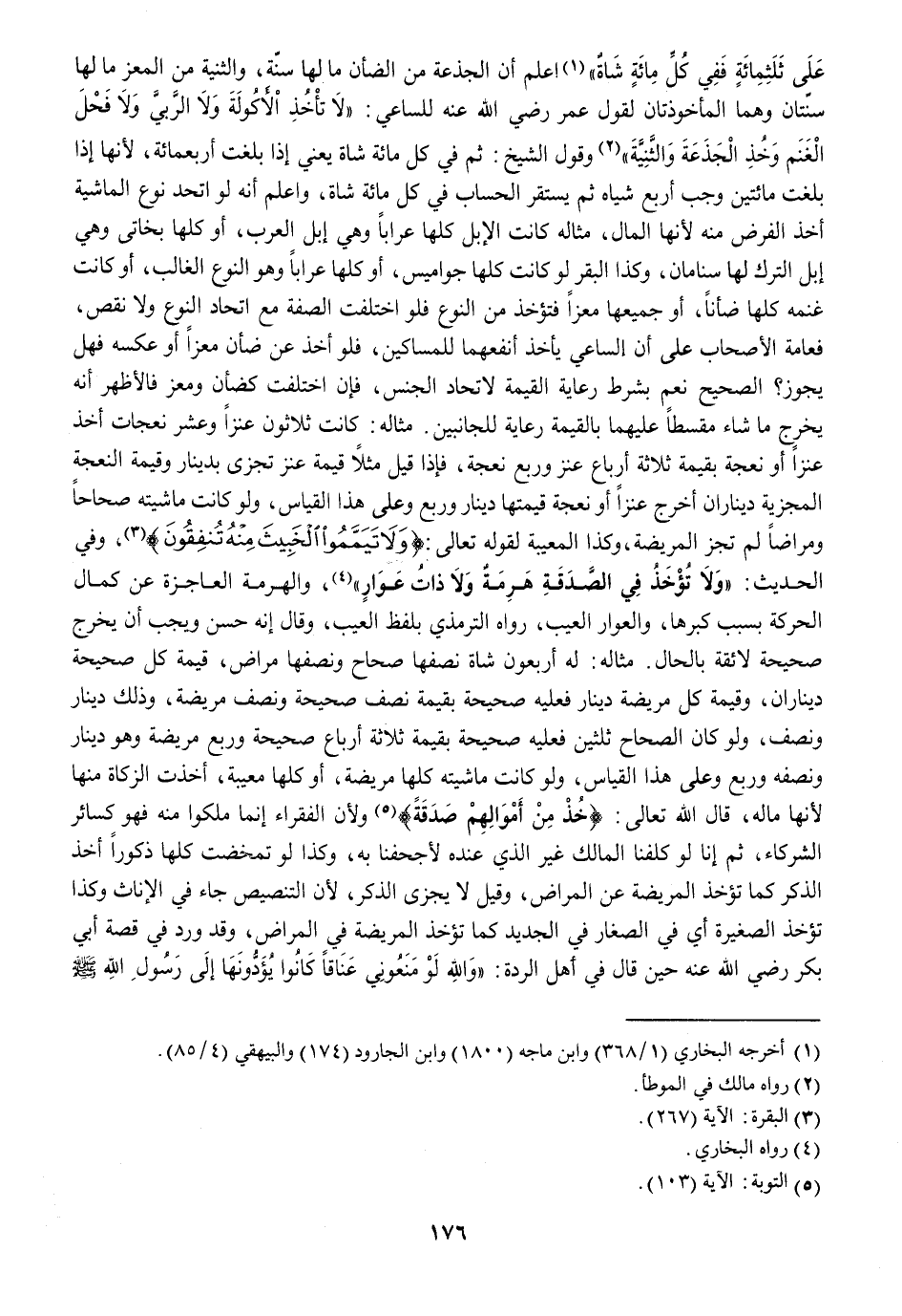 (لَا تَأْخُذ الأكولة وَلَا الربي وَلَا فَحل الْغنم وَخذ الْجَذعَة والثنية) وَقَول الشَّيْخ ثمَّ فِي كل مائَة شَاة يَعْنِي إِذا بلغت أَرْبَعمِائَة لِأَنَّهَا إِذا بلغت مِائَتَيْنِ وَجب أَربع شِيَاه ثمَّ يسْتَقرّ الْحساب فِي كل مائَة شَاة وَاعْلَم أَنه لَو اتَّحد نوع الْمَاشِيَة أَخذ الْفَرْض مِنْهُ لِأَنَّهَا المَال مِثَاله كَانَت الْإِبِل كلهَا عراباً وَهِي إبل الْعَرَب أَو كلهَا بَخَاتِي وَهِي إبل التّرْك لَهَا سنامان وَكَذَا الْبَقر لَو كَانَت كلهَا جواميس أَو كلهَا عراباً وَهُوَ النَّوْع الْغَالِب أَو كَانَت غنمه كلهَا ضأناً أَو جَمِيعهَا معزاً فتؤخذ من النَّوْع فَلَو اخْتلفت الصّفة مَعَ اتِّحَاد النَّوْع وَلَا نقص فعامة الْأَصْحَاب على أَن السَّاعِي يَأْخُذ أنفعهما للْمَسَاكِين فَلَو أَخذ عَن ضَأْن ومعز أَو عَكسه فَهَل يجوز الصَّحِيح نعم بِشَرْط رِعَايَة الْقيمَة لِاتِّحَاد الْجِنْس فَإِن اخْتلفت كضأن ومعز فَالْأَظْهر أَنه يخرج مَا شَاءَ مقسطاً عَلَيْهِمَا بِالْقيمَةِ رِعَايَة للجانبين مِثَاله كَانَت ثَلَاثُونَ عَنْزًا وَعشر نعجات أَخذ عَنْزًا أَو نعجة بِقِيمَة ثَلَاثَة أَربَاع عنز وَربع نعجة فَإِذا قيل مثلا قيمَة عنز تجزى بِدِينَار وَقِيمَة النعجة المجزية دِينَارَانِ أخرج عَنْزًا أَو نعجة قيمتهَا دِينَار وَربع وعَلى هَذَا الْقيَاس وَلَو كَانَت مَاشِيَته صحاحاً ومراضاً لم تجز الْمَرِيضَة وَكَذَا المعيبة لقَوْله تَعَالَى {وَلَا تيمموا الْخَبيث مِنْهُ تنفقون} وَفِي الحَدِيث