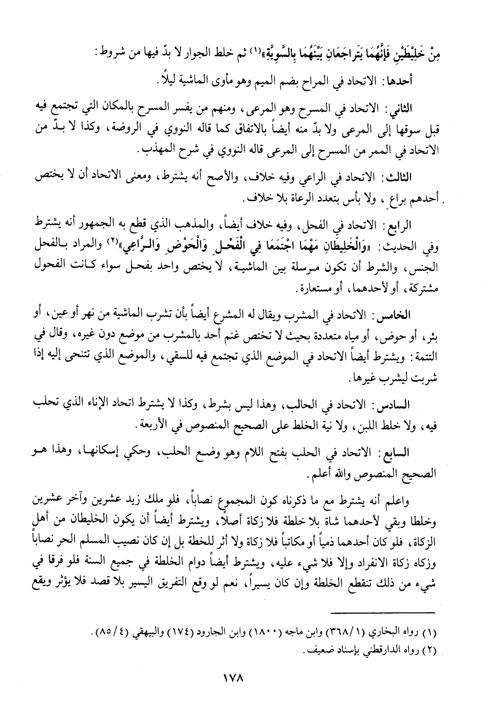 وَاعْلَم أَنه يشْتَرط مَعَ مَا ذَكرْنَاهُ كَون الْمَجْمُوع نِصَابا فَلَو ملك زيد عشْرين وَآخر عشْرين وخلطا وَبَقِي لأَحَدهمَا شَاة بِلَا خلْطَة فَلَا زَكَاة أصلا وَيشْتَرط أَيْضا أَن يكون الخليطان من أهل الزَّكَاة فَلَو كَانَ أَحدهمَا ذِمِّيا أَو مكَاتبا فَلَا زَكَاة وَلَا أثر للخطة بل إِن كَانَ نصيب الْمُسلم الْحر نِصَابا وَزَكَاة زَكَاة الِانْفِرَاد وَإِلَّا فَلَا شَيْء عَلَيْهِ وَيشْتَرط أَيْضا دوَام الْخلطَة فِي جَمِيع السّنة فَلَو فرقا فِي شَيْء من ذَلِك تَنْقَطِع الْخلطَة وَإِن كَانَ يَسِيرا نعم لَو وَقع التَّفْرِيق الْيَسِير بِلَا قصد فَلَا يُؤثر وَيَقَع