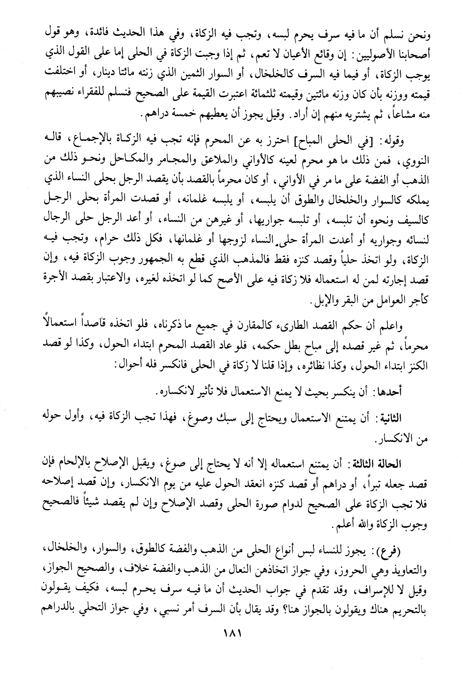 وَنحن نسلم أَن مَا فِيهِ سرف يحرم لبسه وَتجب فِيهِ الزَّكَاة وَفِي هَذَا الحَدِيث فَائِدَة وَهُوَ قَول أَصْحَابنَا الْأُصُولِيِّينَ إِن وقائع الْأَعْيَان لَا تعم ثمَّ إِذا وَجَبت الزَّكَاة فِي الحلى إِمَّا على قَول الَّذِي يُوجب الزَّكَاة أَو فِيمَا فِيهِ السَّرف كالخلخال أَو السوار الثمين الَّذِي زنته مِائَتَا دِينَار أَو اخْتلفت قِيمَته ووزنه بِأَن كَانَ وَزنه مِائَتَيْنِ وَقِيمَته ثلثمِائة اعْتبرت الْقيمَة على الصَّحِيح فنسلم للْفُقَرَاء نصِيبهم مِنْهُ مشَاعا ثمَّ يَشْتَرِيهِ مِنْهُم إِن أَرَادَ وَقيل يجوز أَن يعطيهم خَمْسَة دَرَاهِم