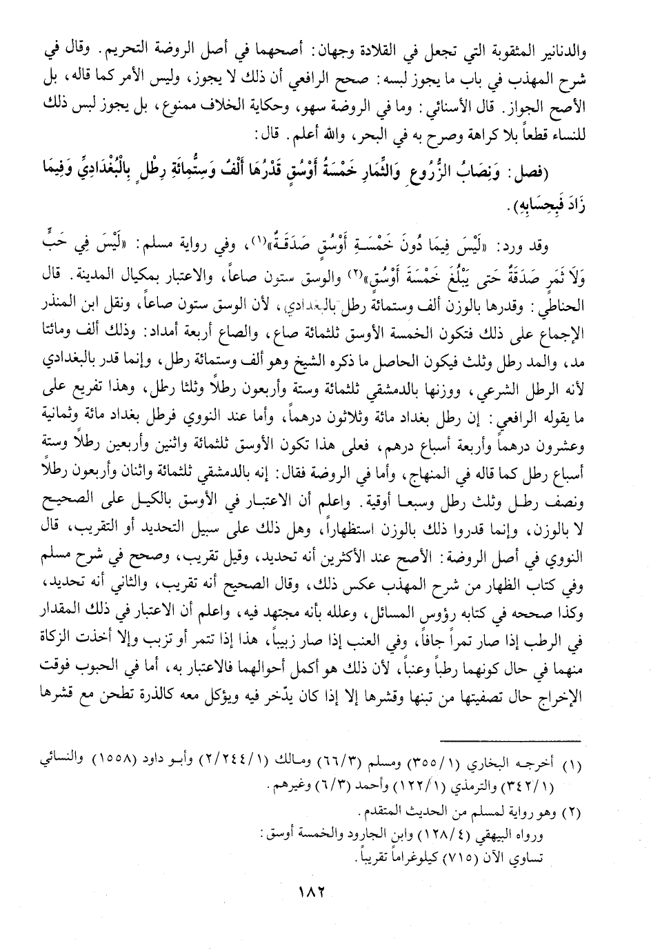 (لَيْسَ فِي حب وَلَا ثَمَر صَدَقَة حَتَّى يبلغ خَمْسَة أوسق) والوسق سِتُّونَ صَاعا وَالِاعْتِبَار بِمِكْيَال الْمَدِينَة قَالَ الحناطي وقدرها بِالْوَزْنِ ألف وسِتمِائَة رَطْل بالبغدادي لِأَن الوسق سِتُّونَ صَاعا وَنقل ابْن الْمُنْذر الْإِجْمَاع على ذَلِك فَتكون الْخَمْسَة الأوسق ثلثمِائة صَاع والصاع أَرْبَعَة أَمْدَاد وَذَلِكَ ألف وَمِائَتَا مد وَالْمدّ رَطْل وَثلث فَيكون الْحَاصِل مَا ذكره الشَّيْخ وَهُوَ ألف وسِتمِائَة رَطْل وَإِنَّمَا قدر بالبغدادي لِأَنَّهُ الرطل الشَّرْعِيّ ووزنها بالدمشقي ثلثمِائة وَسِتَّة وَأَرْبَعُونَ رطلا وَثلثا رَطْل وَهَذَا تَفْرِيع على مَا يَقُوله الرَّافِعِيّ أَن رَطْل بَغْدَاد مائَة وَثَلَاثُونَ درهما وَأما عِنْد النَّوَوِيّ فرطل بَغْدَاد مائَة وَثَمَانِية وَعِشْرُونَ درهما وَأَرْبَعَة أَسْبَاع دِرْهَم فعلى هَذَا تكون الأوسق ثلثمِائة واثنين وَأَرْبَعين رطلا وَسِتَّة أَسْبَاع رَطْل كَمَا قَالَه فِي الْمِنْهَاج وَأما فِي الرَّوْضَة فَقَالَ إِنَّه بالدمشقي ثلثمِائة وَاثْنَانِ وَأَرْبَعُونَ رطلا وَنصف رَطْل وَثلث رَطْل وَسبعا أُوقِيَّة وَاعْلَم أَن الِاعْتِبَار فِي الأوسق بِالْكَيْلِ على الصَّحِيح لَا بِالْوَزْنِ وَإِنَّمَا قدرُوا ذَلِك بِالْوَزْنِ استظهاراً وَهل ذَلِك على سَبِيل التَّحْدِيد أَو التَّقْرِيب قَالَ النَّوَوِيّ فِي أصل الرَّوْضَة الْأَصَح عِنْد الْأَكْثَرين أَنه تَحْدِيد وَقيل تقريب وَصحح فِي شرح مُسلم وَفِي كتاب الظِّهَار من شرح الْمُهَذّب عكس ذَلِك وَقَالَ الصَّحِيح أَنه تقريب وَالثَّانِي أَنه تَحْدِيد وَكَذَا صَححهُ فِي كِتَابه رُؤُوس الْمسَائِل وَعلله بِأَنَّهُ مُجْتَهد فِيهِ وَاعْلَم أَن الِاعْتِبَار فِي ذَلِك الْمِقْدَار فِي الرطب إِذا صَار تَمرا جافاً وَفِي الْعِنَب إِذا صَار زبيباً هَذَا إِذا تتمر أَو تزبب وَإِلَّا أخذت الزَّكَاة مِنْهُمَا فِي الْحَال كَونهمَا رطبا وَعِنَبًا لِأَن ذَلِك هُوَ أكمل أحوالهما فالاعتبار بِهِ أما فِي الْحُبُوب فوقت الْإِخْرَاج حَال تصفيتها من تبنها وقشرها إِلَّا إِذا كَانَ يدّخر فِيهِ ويؤكل مَعَه كالذرة تطحن مَعَ قشرها