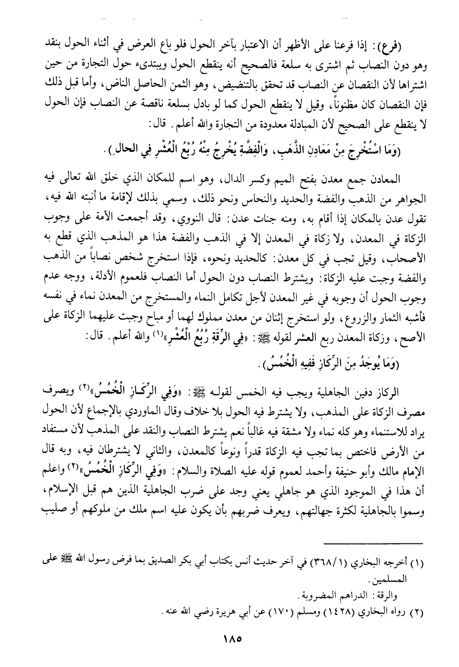 الْمَعَادِن جمع مَعْدن بِفَتْح الْمِيم وَكسر الدَّال وَهُوَ اسْم للمكان الَّذِي خلق الله تَعَالَى فِيهِ الْجَوَاهِر من الذَّهَب وَالْفِضَّة وَالْحَدِيد والنحاس وَنَحْو ذَلِك وَسمي بذلك لإِقَامَة مَا أَنْبَتَهُ الله فِيهِ تَقول عدن بِالْمَكَانِ إِذا أَقَامَ بِهِ وَمِنْه جنَّات عدن قَالَ النَّوَوِيّ وَقد أَجمعت الْأمة على وجوب الزَّكَاة فِي الْمَعْدن وَلَا زَكَاة فِي الْمَعْدن إِلَّا فِي الذَّهَب وَالْفِضَّة هَذَا هُوَ الْمَذْهَب الَّذِي قطع بِهِ الْأَصْحَاب وَقيل تجب فِي كل مَعْدن كالحديد وَنَحْوه فَإِذا استخرج شخص نِصَابا من الذَّهَب وَالْفِضَّة وَجَبت عَلَيْهِ الزَّكَاة وَيشْتَرط النّصاب دون الْحول أما النّصاب فلعموم الْأَدِلَّة وَوجه عدم وجوب الْحول أَن وُجُوبه فِي غير الْمَعْدن لأجل تَكَامل النَّمَاء والمستخرج من الْمَعْدن نَمَاء فِي نَفسه فَأشبه الثِّمَار والزروع وَلَو استخرج اثْنَان من مَعْدن مَمْلُوك لَهما أَو مُبَاح وَجَبت عَلَيْهِمَا الزَّكَاة على الْأَصَح وَزَكَاة الْمَعْدن ربع الْعشْر لقَوْله صلى الله عَلَيْهِ وَسلم