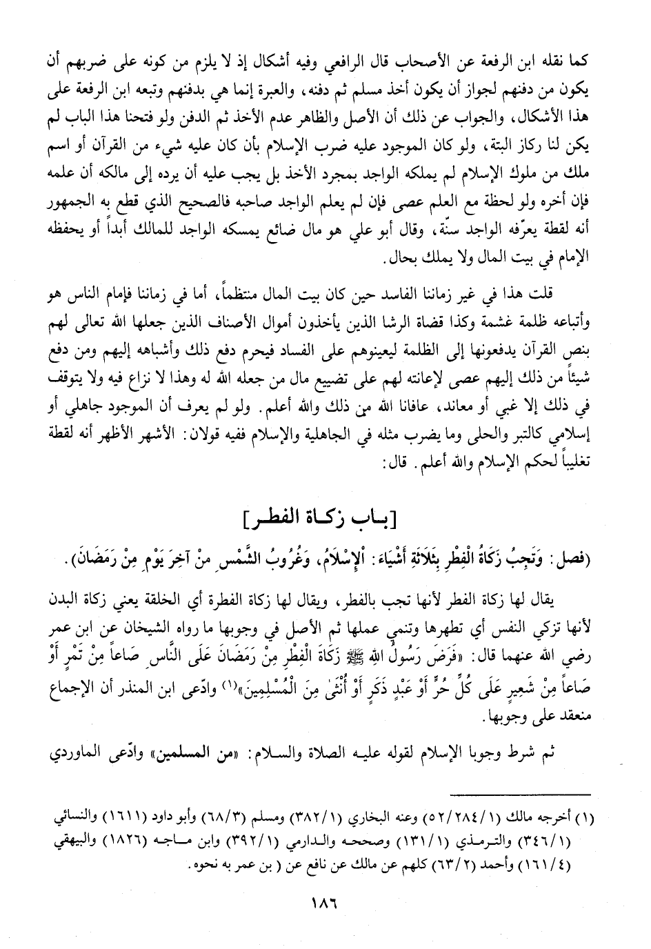 (فرض رَسُول الله صلى الله عَلَيْهِ وَسلم زَكَاة الْفطر على النَّاس صَاعا من تمر أَو صَاعا من شعير على كل حر أَو عبد ذكر أَو أُنْثَى من الْمُسلمين) وَادّعى ابْن الْمُنْذر أَن الْإِجْمَاع مُنْعَقد على وُجُوبهَا