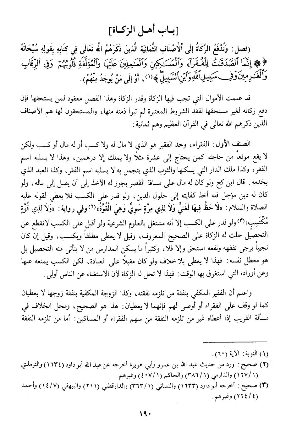 الصِّنْف الأول الْفُقَرَاء وحد الْفَقِير هُوَ الَّذِي لَا مَال لَهُ وَلَا كسب أَو لَهُ مَال أَو كسب وَلَكِن لَا يَقع موقعاً من حَاجته كمن يحْتَاج إِلَى عشرَة مثلا وَلَا يملك إِلَّا دِرْهَمَيْنِ وَهَذَا لَا يسلبه اسْم الْفقر وَكَذَا ملك الدَّار الَّتِي يسكنهَا وَالثَّوْب الَّذِي يتجمل بِهِ لَا يسلبه اسْم الْفقر وَكَذَا العَبْد الَّذِي يَخْدمه قَالَ ابْن كج وَلَو كَانَ لَهُ مَال على مَسَافَة الْقصر يجوز لَهُ الْأَخْذ إِلَى أَن يصل إِلَى مَاله وَلَو كَانَ لَهُ دين مُؤَجل فَلهُ أَخذ كِفَايَته إِلَى حُلُول الدّين وَلَو قدر على الْكسْب فَلَا يعْطى لقَوْله عَلَيْهِ الصَّلَاة وَالسَّلَام
