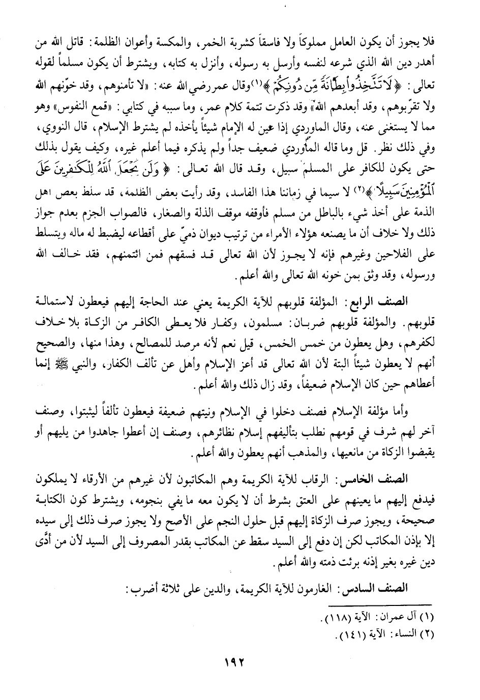 الصِّنْف الرَّابِع الْمُؤَلّفَة قُلُوبهم لِلْآيَةِ الْكَرِيمَة يَعْنِي عِنْد الْحَاجة إِلَيْهِم فيعطون لاستمالة قُلُوبهم والمؤلفة قُلُوبهم ضَرْبَان مُسلمُونَ وكفار فَلَا يعْطى الْكَافِر من الزَّكَاة بِلَا خلاف لكفرهم وَهل يُعْطون من خمس الْخمس قيل نعم لِأَنَّهُ مرصد للْمصَالح وَهَذَا مِنْهَا وَالصَّحِيح أَنهم لَا يُعْطون شَيْئا أَلْبَتَّة لِأَن الله تَعَالَى قد أعز الْإِسْلَام وَأَهله عَن تألف الْكفَّار وَالنَّبِيّ صلى الله عَلَيْهِ وَسلم إِنَّمَا أَعْطَاهُم حِين كَانَ الْإِسْلَام ضَعِيفا وَقد زَالَ ذَلِك وَالله أعلم