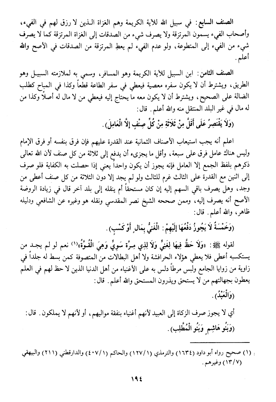 الصِّنْف السَّابِع فِي سَبِيل الله للآيه الْكَرِيمَة وهم الْغُزَاة الَّذين لَا رزق لَهُم فِي الفىء وَأَصْحَاب الفىء يسمون المرتزقة وَلَا يصرف شَيْء من الصَّدقَات إِلَى الْغُزَاة المرتزقة كَمَا لَا يصرف شَيْء من الْفَيْء إِلَى المتطوعة وَلَو عدم الْفَيْء لم يُعْط المرتزقة من الصَّدقَات فِي الْأَصَح وَالله أعلم