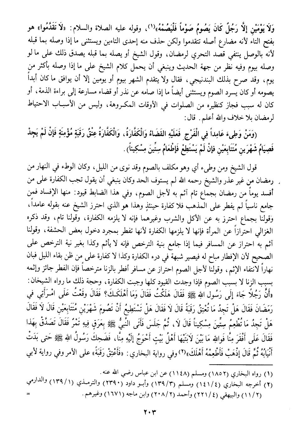 (لَا تقدمُوا) هُوَ بِفَتْح التَّاء لِأَنَّهُ مضارع أَصله تتقدموا وَلَكِن حذف مِنْهُ إِحْدَى التَّاءَيْنِ وَيسْتَثْنى مَا إِذا وَصله بِمَا قبله لِأَنَّهُ بالوصل يَنْتَفِي التَّحَرِّي لرمضان وَقَول الشَّيْخ أَو يصله بِمَا قبله يصدق ذَلِك على مَا لَو وَصله بِيَوْم وَفِيه نظر من جِهَة الحَدِيث وَيَنْبَغِي أَن يحمل كَلَام الشَّيْخ على مَا إِذا وَصله بِأَكْثَرَ من يَوْم وَقد صرح بذلك الْبَنْدَنِيجِيّ فَقَالَ وَلَا يتَقَدَّم الشَّهْر بِيَوْم أَو يَوْمَيْنِ إِلَّا إِ يُوَافق مَا كَانَ أبدا يَصُومهُ أَو كَانَ يسْرد الصَّوْم وَيسْتَثْنى أَيْضا مَا إِذا صَامَهُ عَن نذر أَو قَضَاء مسارعة إِلَى بَرَاءَة الذِّمَّة أَو كَانَ لَهُ سَبَب فَجَاز كَنَظِيرِهِ من الصَّلَوَات فِي الْأَوْقَات الْمَكْرُوهَة وَلَيْسَ من الْأَسْبَاب الِاحْتِيَاط لرمضان بِلَا خلاف وَالله أعلم قَالَ
