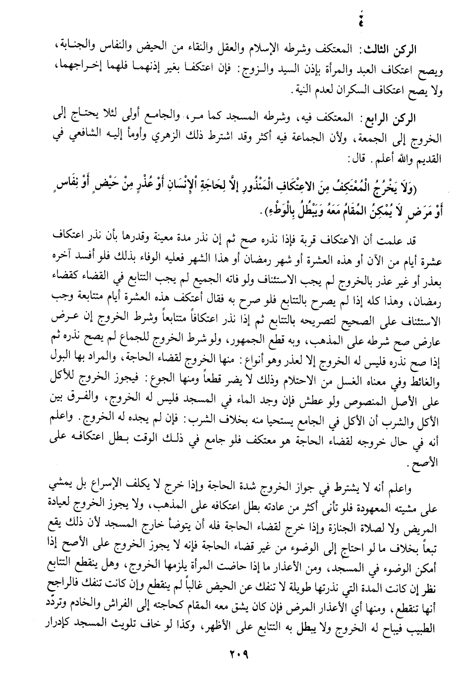 وَاعْلَم أَنه لَا يشْتَرط فِي جَوَاز الْخُرُوج شدَّة الْحَاجة وَإِذا خرج لَا يُكَلف الْإِسْرَاع بل يمشي على مشيته الْمَعْهُودَة فَلَو تأنى أَكثر من عَادَته بَطل اعْتِكَافه على الْمَذْهَب وَلَا يجوز الْخُرُوج لعيادة الْمَرِيض وَلَا لصَلَاة الْجِنَازَة وَإِذا خرج لقَضَاء الْحَاجة فَلهُ أَن يتَوَضَّأ خَارج الْمَسْجِد لِأَن ذَلِك يَقع تبعا بِخِلَاف مَا لَو احْتَاجَ إِلَى الْوضُوء من غير قَضَاء الْحَاجة فَإِنَّهُ لَا يجوز الْخُرُوج على الْأَصَح إِذا أمكن الْوضُوء فِي الْمَسْجِد وَمن الْأَعْذَار مَا إِذا حَاضَت الْمَرْأَة يلْزمهَا الْخُرُوج وَهل يَنْقَطِع التَّتَابُع نظر إِن كَانَت الْمدَّة الَّتِي نذرتها طَوِيلَة لَا تنفك عَن الْحيض غَالِبا لم يَنْقَطِع وَإِن كَانَت تنفك فالراجح أَنَّهَا تَنْقَطِع وَمِنْهَا أَي الْأَعْذَار الْمَرَض فَإِن كَانَ يشق مَعَه الْمقَام كحاجته إِلَى الْفراش وَالْخَادِم وَتردد الطَّبِيب فَيُبَاح لَهُ الْخُرُوج وَلَا يبطل بِهِ التَّتَابُع على الْأَظْهر وَكَذَا لَو خَافَ تلويث الْمَسْجِد كإدرار