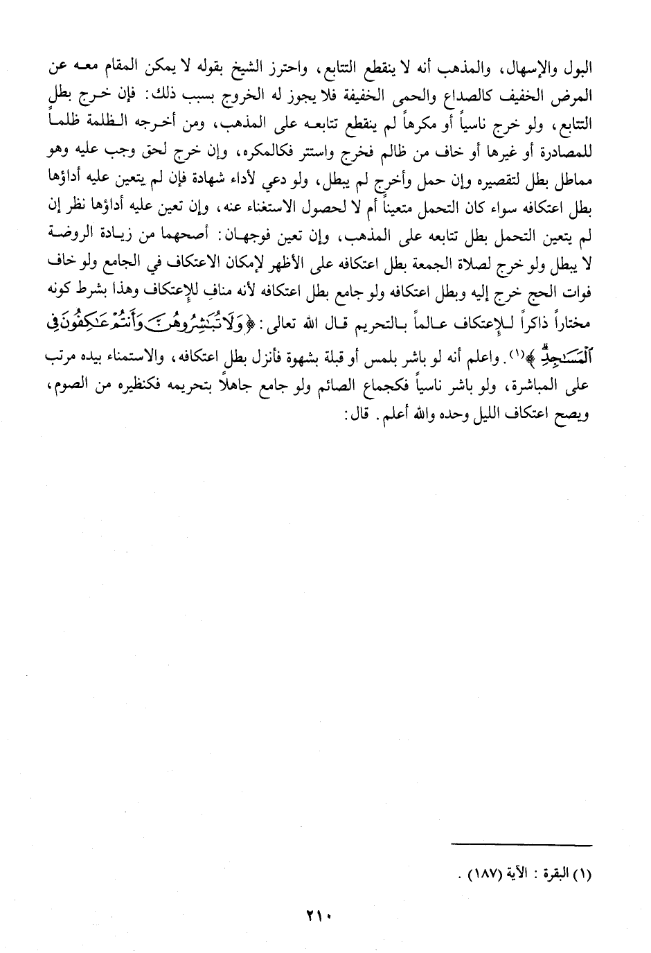 الْبَوْل والإسهال وَالْمذهب أَنه يَنْقَطِع التَّتَابُع وَاحْترز الشَّيْخ بقوله لَا يُمكن الْمقَام مَعَه عَن الْمَرَض الْخَفِيف كالصداع والحمى الْخَفِيفَة فَلَا يجوز لَهُ الْخُرُوج بِسَبَب ذَلِك فَإِن خرج بَطل التَّتَابُع وَلَو خرج نَاسِيا أَو مكْرها لم يَنْقَطِع تتابعه على الْمَذْهَب وَمن أخرجه الظلمَة ظلما للمصادرة أَو غَيرهَا أَو خَافَ من ظَالِم فَخرج واستتر فكالمكره وَإِن خرج لحق وَجب عَلَيْهِ وَهُوَ مماطل بَطل لتَقْصِيره وَإِن حمل وَأخرج لم يبطل وَلَو دعِي لأَدَاء شَهَادَة فَإِن لم يتَعَيَّن عَلَيْهِ أَدَاؤُهَا بَطل اعْتِكَافه سَوَاء كَانَ التَّحَمُّل مُتَعَيّنا أم لَا لحُصُول الِاسْتِغْنَاء عَنهُ وَإِن تعين عَلَيْهِ أَدَاؤُهَا نظر إِن لم يتَعَيَّن التَّحَمُّل بَطل تتابعه على الْمَذْهَب وَإِن تعين فَوَجْهَانِ أصَحهمَا من زِيَادَة الرَّوْضَة لَا يبطل وَلَو خرج لصَلَاة الْجُمُعَة بَطل اعْتِكَافه على الْأَظْهر لِإِمْكَان الِاعْتِكَاف فِي الْجَامِع وَلَو خَافَ فَوَات الْحَج خرج إِلَيْهِ وَبَطل اعْتِكَافه وَلَو جَامع بَطل اعْتِكَافه لِأَنَّهُ منَاف للاعتكاف وَهَذَا بِشَرْط كَونه مُخْتَارًا ذَاكِرًا للاعتكاف عَالما بِالتَّحْرِيمِ قَالَ الله تَعَالَى {وَلا تُبَاشِرُوهُنَّ وَأَنْتُمْ عَاكِفُونَ فِي الْمَسَاجِدِ} وَاعْلَم أَنه لَو بَاشر بلمس أَو قبْلَة بِشَهْوَة فَأنْزل بَطل اعْتِكَافه والاستمناء بِيَدِهِ مُرَتّب على الْمُبَاشرَة وَلَو بَاشر نَاسِيا فكجماع الصَّائِم وَلَو جَامع جَاهِلا بِتَحْرِيمِهِ فكنظيره من الصَّوْم وَيصِح اعْتِكَاف اللَّيْل وَحده وَالله أعلم