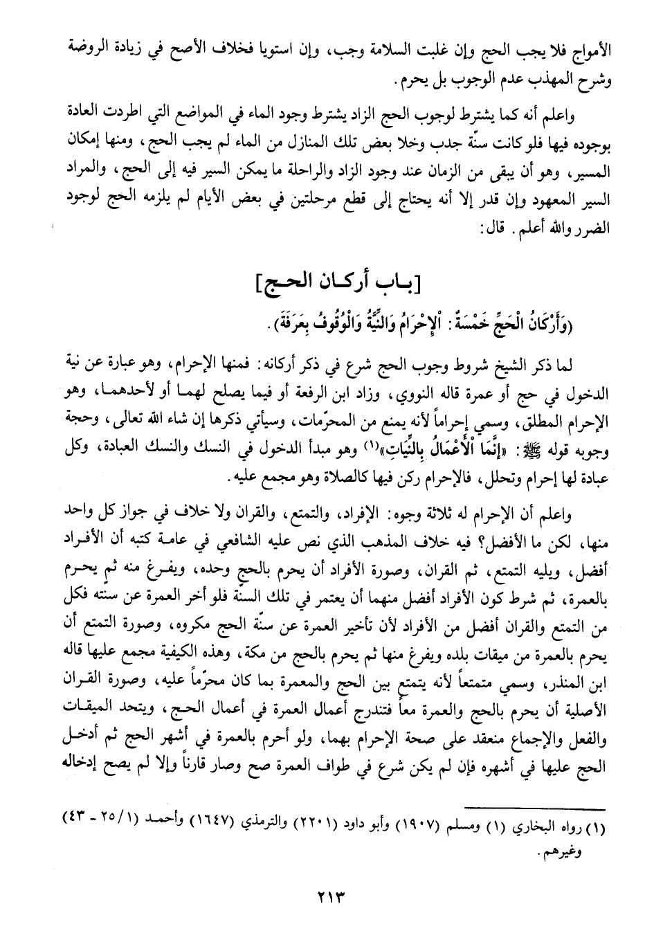 (إِنَّمَا الْأَعْمَال بِالنِّيَّاتِ) وَهُوَ مبدأ الدُّخُول فِي النّسك والنسك الْعِبَادَة وكل عبَادَة لَهَا إِحْرَام وتحلل فالإحرام ركن فِيهَا كَالصَّلَاةِ وَهُوَ مجمع عَلَيْهِ