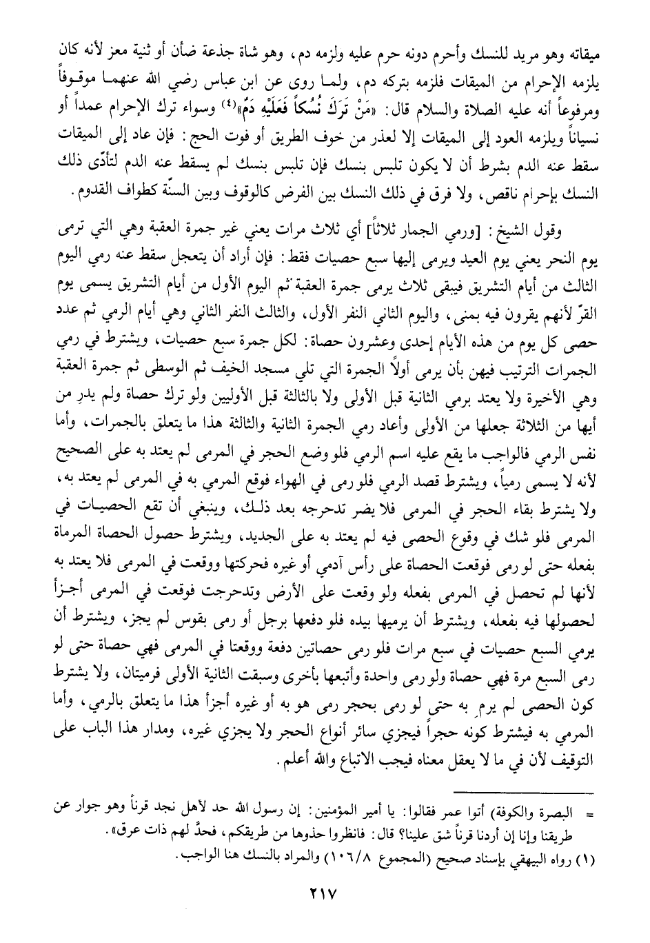 وَقَول الشَّيْخ وَرمي الْجمار ثَلَاثًا أَي ثَلَاث مَرَّات يَعْنِي غير جَمْرَة الْعقبَة وَهِي الَّتِي ترمى يَوْم النَّحْر يَعْنِي يَوْم الْعِيد وَيَرْمِي إِلَيْهَا سبع حَصَيَات فَقَط فَإِن أَرَادَ أَن يتعجل سقط عَنهُ رمي الْيَوْم الثَّالِث من أَيَّام التَّشْرِيق فَيبقى ثَلَاث يَرْمِي جَمْرَة الْعقبَة ثمَّ الْيَوْم الأول من أَيَّام التَّشْرِيق يُسمى يَوْم القر لأَنهم يقرونَ فِيهِ بمنى وَالْيَوْم الثَّانِي النَّفر الأول وَالثَّالِث النَّفر الثَّانِي وَهِي أَيَّام الرَّمْي ثمَّ عدد حَصى كل يَوْم من هَذِه الْأَيَّام إِحْدَى وَعِشْرُونَ حَصَاة لكل جَمْرَة سبع حَصَيَات وَيشْتَرط فِي رمي الجمرات التَّرْتِيب فِيهِنَّ بِأَن يَرْمِي أَولا الْجَمْرَة الَّتِي تلِي مَسْجِد الْخيف ثمَّ الْوُسْطَى ثمَّ جَمْرَة الْعقبَة وَهِي الْأَخِيرَة وَلَا يعْتد برمي الثَّانِيَة قبل الأولى وَلَا بالثالثة قبل الْأَوليين وَلَو ترك حَصَاة وَلم يدر من أَيهَا من الثَّلَاثَة جعلهَا من الأولى وَأعَاد رمي الْجَمْرَة الثَّانِيَة وَالثَّالِثَة هَذَا مَا يتَعَلَّق بالجمرات وَأما نفس الرَّمْي فَالْوَاجِب مَا يَقع عَلَيْهِ اسْم الرَّمْي فَلَو وضع الْحجر فِي المرمى لم يعْتد بِهِ على الصَّحِيح لِأَنَّهُ لَا يُسمى رمياً وَيشْتَرط قصد الرَّمْي فَلَو رمى فِي الْهَوَاء فَوَقع المرمي بِهِ فِي المرمى لم يعْتد بِهِ وَلَا يشْتَرط بَقَاء الْحجر فِي المرمى فَلَا يضر تدحرجه بعد ذَلِك وَيَنْبَغِي أَن تقع الحصيات فِي المرمى فَلَو شكّ فِي وُقُوع الْحَصَى فِيهِ لم يعْتد بِهِ على الْجَدِيد وَيشْتَرط حُصُول الْحَصَاة المرماة بِفِعْلِهِ حَتَّى لَو رمى فَوَقَعت الْحَصَاة على رَأس آدَمِيّ أَو غَيره فحركتها وَوَقعت فِي المرمى فَلَا يعْتد بِهِ لِأَنَّهَا لم تحصل فِي المرمى بِفِعْلِهِ وَلَو وَقعت على الأَرْض وتدحرجت فَوَقَعت فِي المرمى أَجْزَأَ لحصولها فِيهِ بِفِعْلِهِ وَيشْتَرط أَن يرميها بِيَدِهِ فَلَو دَفعهَا بِرَجُل أَو رمى بقوس لم يجز وَيشْتَرط أَن يَرْمِي السَّبع حَصَيَات فِي سبع مَرَّات فَلَو رمى حصاتين دفْعَة ووقعتا فِي المرمى فَهِيَ حَصَاة حَتَّى لَو رمى السَّبع مرّة فَهِيَ حَصَاة وَلَو رمى وَاحِدَة وأتبعها بِأُخْرَى وسبقت الثَّانِيَة الأولى فرميتان وَلَا يشْتَرط كَون الْحَصَى لم يرم بِهِ حَتَّى لَو رمى بِحجر رمى هُوَ بِهِ أَو غَيره أَجْزَأَ هَذَا مَا يتَعَلَّق بِالرَّمْي وَأما المرمي بِهِ فَيشْتَرط كَونه حجرا فيجزى سَائِر أَنْوَاع الْحجر وَلَا يَجْزِي غَيره ومدار هَذَا الْبَاب على التَّوْقِيف لِأَن فِي مَا لَا يعقل مَعْنَاهُ فَيجب الِاتِّبَاع وَالله أعلم