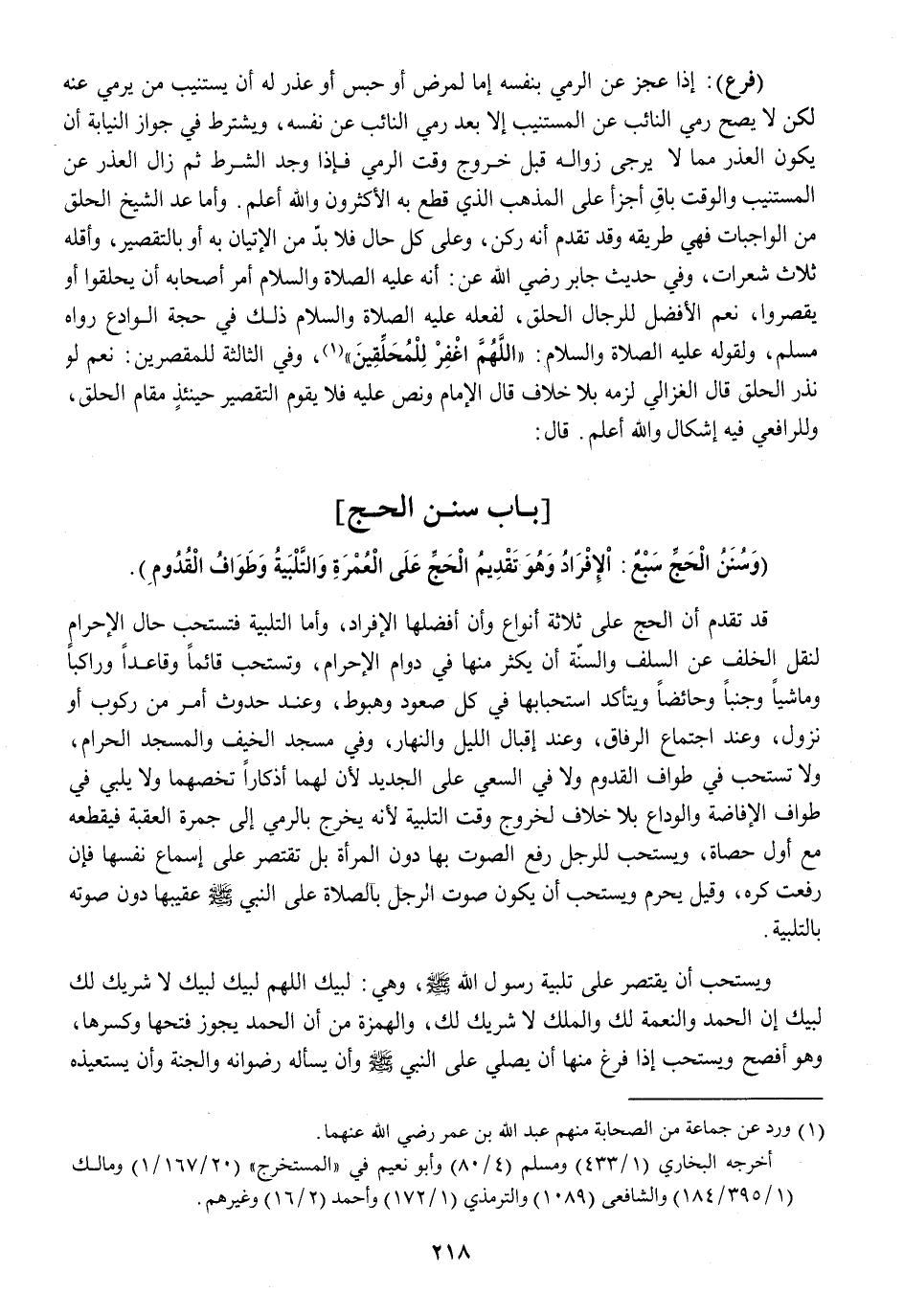 (فرع) إِذا عجز عَن الرَّمْي بِنَفسِهِ إِمَّا لمَرض أَو حبس أَو عذر لَهُ أَن يَسْتَنِيب من يَرْمِي عَنهُ لَكِن لَا يَصح رمي النَّائِب عَن المستنيب إِلَّا بعد رمي النَّائِب عَن نَفسه وَيشْتَرط فِي جَوَاز النِّيَابَة أَن يكون الْعذر مِمَّا لَا يُرْجَى زَوَاله قبل خُرُوج وَقت الرَّمْي فَإِذا وجد الشَّرْط ثمَّ زَالَ الْعذر عَن المستنيب وَالْوَقْت بَاقٍ أَجْزَأَ على الْمَذْهَب الَّذِي قطع بِهِ الْأَكْثَرُونَ وَالله أعلم وَأما عد الشَّيْخ الْحلق من الْوَاجِبَات فَهِيَ طَريقَة وَقد تقدم أَنه ركن وعَلى كل حَال فَلَا بُد من الْإِتْيَان بِهِ أَو بالتقصير وَأقله ثَلَاث شَعرَات وَفِي حَدِيث جَابر رَضِي الله عَنهُ عَن أَنه عَلَيْهِ الصَّلَاة وَالسَّلَام أَمر أَصْحَابه أم بحلقوا أَو يقصروا نعم الْأَفْضَل للرِّجَال الْحلق لفعله عَلَيْهِ الصَّلَاة وَالسَّلَام ذَلِك فِي حجَّة الْوَدَاع رَوَاهُ مُسلم وَلقَوْله عَلَيْهِ الصَّلَاة وَالسَّلَام