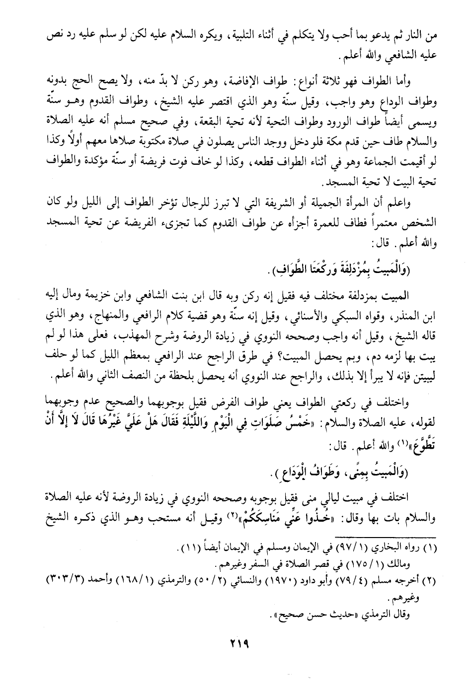 وَأما الطّواف فَهُوَ ثَلَاثَة أَنْوَاع طواف الافاضة وَهُوَ ركن لَا بُد مِنْهُ وَلَا يَصح الْحَج بِدُونِهِ وَطواف الْوَدَاع وَهُوَ وَاجِب وَقيل سنة وَهُوَ الَّذِي اقْتصر عَلَيْهِ الشَّيْخ وَطواف الْقدوم وَهُوَ سنة وَيُسمى أَيْضا طواف الْوُرُود وَطواف التَّحِيَّة لِأَنَّهُ تَحِيَّة الْبقْعَة وَفِي صَحِيح مُسلم أَنه عَلَيْهِ الصَّلَاة وَالسَّلَام طَاف حِين قدم مَكَّة فَلَو دخل وَوجد النَّاس يصلونَ فِي صَلَاة مَكْتُوبَة صلاهَا مَعَهم أَولا وَكَذَا لَو أُقِيمَت الْجَمَاعَة وَهُوَ فِي أثْنَاء الطّواف قطعه وَكَذَا لَو خَافَ فَوت فَرِيضَة أَو سنة مُؤَكدَة وَالطّواف تَحِيَّة الْبَيْت لَا تَحِيَّة الْمَسْجِد