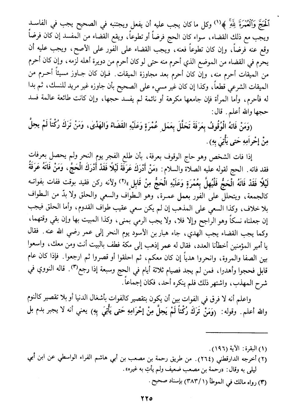 (من أدْرك عَرَفَة لَيْلًا فقد أدْرك الْحَج وَمن فَاتَهُ عَرَفَة لَيْلًا فقد فَاتَهُ الْحَج فليهل بِعُمْرَة وَعَلِيهِ الْحَج من قَابل) وَلِأَنَّهُ ركن فقيد بِوَقْت ففات بفواته كَالْجُمُعَةِ ويتحلل على الْفَوْر بِعَمَل عمْرَة وَهُوَ الطّواف وَالسَّعْي وَالْحلق وَلَا بُد من الطّواف بِلَا خلاف وَكَذَا السَّعْي على الْمَذْهَب إِن لم يكن سعى عقيب طواف الْقدوم وَأما الْحلق فَيجب إِن جَعَلْنَاهُ نسكا وَهُوَ الرَّاجِح وَإِلَّا فَلَا وَلَا يجب الرَّمْي بمنى وَكَذَا الْمبيت بهَا وَإِن بفي وقتهما وكما يجب الْقَضَاء يجب الْهَدْي جَاءَ هَبَّار بن الْأسود يَوْم النَّحْر إِلَى عمر رَضِي الله عَنهُ فَقَالَ يَا أَمِير الْمُؤمنِينَ أَخْطَأنَا الْعدَد فَقَالَ لَهُ عمر اذْهَبْ إِلَى مَكَّة فَطُفْ بِالْبَيْتِ أَنْت وَمن مَعَك واسعوا بَين الصَّفَا والمروة وانحروا هَديا إِن كَانَ مَعكُمْ ثمَّ احْلقُوا أَو قصروا ثمَّ ارْجعُوا فَإِذا كَانَ عَام قَابل فحجوا وأهدوا فَمن لم يجد فَصِيَام ثَلَاثَة أَيَّام فِي الْحَج وَسَبْعَة إِذا رَجَعَ قَالَه النَّوَوِيّ فِي شرح الْمُهَذّب واشتهر ذَلِك فَلم يُنكره أحد فَكَانَ إِجْمَاعًا