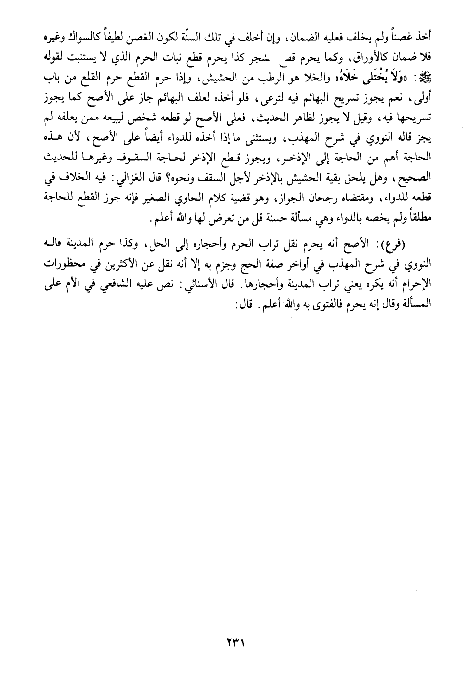 (وَلَا يخْتَلى خلاه) والخلا هُوَ الرطب من الْحَشِيش وَإِذا حرم الْقطع حرم الْقلع من بَاب أولى نعم يجوز تَسْرِيح الْبَهَائِم فِيهِ لترعى فَلَو أَخذه لعلف الْبَهَائِم جَازَ على الْأَصَح كَمَا يجوز تسريحها فِيهِ وَقيل لَا يجوز لظَاهِر الحَدِيث فعلى الْأَصَح لَو قطعه شخص ليَبِيعهُ مِمَّن يعلفه لم يجز قَالَ النَّوَوِيّ فِي شرح الْمُهَذّب وَيسْتَثْنى مَا إِذا أَخذه للدواء أَيْضا على الْأَصَح لِأَن هَذِه الْحَاجة أهم من الْحَاجة إِلَى الأذخر وَيجوز قطع الغذخر لحَاجَة السقوف وَغَيرهَا للْحَدِيث الصَّحِيح وَهل يلْحق بَقِيَّة الْحَشِيش بالأذخر لأجل السّقف وَنَحْوه قَالَ الْغَزالِيّ فِيهِ الْخلاف فِي قطعه للدواء وَمُقْتَضَاهُ رُجْحَان الْجَوَاز وَهُوَ قَضِيَّة كَلَام الْحَاوِي الصَّغِير فَإِنَّهُ جوز الْقطع للْحَاجة مُطلقًا وَلم يَخُصُّهُ بالدواء وَهِي مَسْأَلَة حَسَنَة قل من تعرض لَهَا وَالله أعلم
