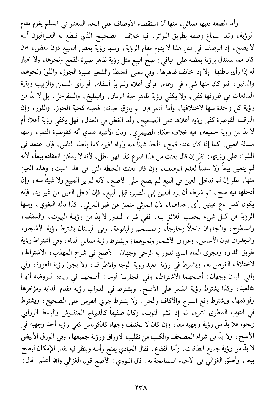 وَأما الصّفة فَفِيهَا مسَائِل مِنْهَا أَن استقصاء الْأَوْصَاف على الْحَد الْمُعْتَبر فِي السّلم يقوم مقَام الرُّؤْيَة وَكَذَا سَماع وَصفه بطرِيق التَّوَاتُر فِيهِ خلاف الصَّحِيح الَّذِي قطع بِهِ الْعِرَاقِيُّونَ أَنه لَا يَصح إِذْ الْوَصْف فِي مثل هَذَا لَا يقوم مقَام الرُّؤْيَة وَمِنْهَا رُؤْيَة بعض الْمَبِيع دون بعض فَإِن كَانَ مِمَّا يسْتَدلّ بِرُؤْيَة بعضه على الْبَاقِي صَحَّ البيع مثل رُؤْيَة ظَاهر صبرَة الْقَمْح وَنَحْوهَا وَلَا خِيَار لَهُ إِذا رأى بَاطِنهَا إِلَّا إِذا خَالف ظَاهرهَا وَفِي معنى الْحِنْطَة وَالشعِير صبرَة الْجَوْز واللوز وَنَحْوهمَا والدقيق فَلَو كَانَ مِنْهَا شَيْء فِي وعَاء فَرَأى أَعْلَاهُ وَلم ير أَسْفَله أَو رأى السّمن وَالزَّبِيب وَبَقِيَّة الْمَائِعَات فِي ظروفها كفى وَلَا يَكْفِي رُؤْيَة ظَاهر حَبَّة الرُّمَّان والبطيخ والسفرجل بل لَا بُد من رُؤْيَة كل وَاحِدَة مِنْهَا لاختلافها وَأما التَّمْر فَإِن لم يلزق حباته فحبته كحبة الْجَوْز واللوز وَإِن التزقت القوصرة كفى رُؤْيَة أَعْلَاهَا على الصَّحِيح وَأما الْقطن فِي الْعدْل فَهَل يَكْفِي رُؤْيَة أَعْلَاهُ أم لَا بُد من رُؤْيَة جَمِيعه فِيهِ خلاف حَكَاهُ الصَّيْمَرِيّ وَقَالَ الْأَشْبَه عِنْدِي أَنه كقوصرة التَّمْر وَمِنْهَا مَسْأَلَة الْعين كَمَا إِذا كَانَ عِنْده قَمح فَأخذ شَيْئا مِنْهُ وَأرَاهُ لغيره كَمَا يَفْعَله النَّاس فَإِن اعْتمد فِي الشِّرَاء على رؤيتها نظر إِن قَالَ بِعْتُك من هَذَا النَّوْع كَذَا فَهُوَ بَاطِل لِأَنَّهُ لَا يُمكن انْعِقَاده بيعا لِأَنَّهُ لم يتَعَيَّن بيعا وَلَا سلما لعدم الْوَصْف وَإِن قَالَ بِعْتُك الْحِنْطَة الَّتِي فِي هَذَا الْبَيْت وَهَذِه الْعين مِنْهَا نظر إِن لم تدخل الْعين فِي البيع لم يَصح على اأصح لِأَنَّهُ لم ير الْمَبِيع وَلَا شَيْئا مِنْهُ وَإِن أدخلها فِيهِ صَحَّ ثمَّ شَرطه أَن يرد الْعين إِلَى الصُّبْرَة قبل البيع فَإِن أَدخل الْعين من غير رد فَإِنَّهُ يكون كَمَا بَاعَ عينين رأى أَحدهمَا لِأَن المرئي متميز عَن غير المرئي كَذَا قَالَه الْبَغَوِيّ وَمِنْهَا الرُّؤْيَة فِي كل شَيْء بِحَسب اللَّائِق بِهِ فَفِي شِرَاء الدّور لَا بُد من رُؤْيَة الْبيُوت والسقف والسطوح والجدران دَاخِلا وخارجاً والمستحم والبالوعة وَفِي الْبُسْتَان يشْتَرط رُؤْيَة مسايل المَاء وَفِي اشْتِرَاط رُؤْيَة طَرِيق الدَّار ومجرى المَاء الَّذِي تَدور بِهِ الرَّحَى وَجْهَان الْأَصَح فِي شرح الْمُهَذّب الِاشْتِرَاط لاخْتِلَاف الْغَرَض بِهِ وَيشْتَرط فِي رُؤْيَة العَبْد رُؤْيَة الْوَجْه والأطراف وَلَا يجوز رُؤْيَة الْعَوْرَة وَفِي بَاقِي الْبدن وَجْهَان أصَحهمَا الِاشْتِرَاط وَفِي الْجَارِيَة أوجه أَصَحهَا فِي زِيَادَة الرَّوْضَة أَنَّهَا كَالْعَبْدِ وَكَذَا يشْتَرط رُؤْيَة الشّعْر على الْأَصَح وَيشْتَرط فِي الدَّوَابّ رُؤْيَة مقدم الدَّابَّة ومؤخرها وقوائمها وَيشْتَرط رفع السرج والأكاف والجل وَلَا يشْتَرط جري الْفرس على الصَّحِيح وَيشْتَرط فِي الثَّوْب المطوي نشره ثمَّ إِذا نشر الثَّوْب وَكَانَ صفيقاً كالديباج المنقوش والبسط الزرابي وَنَحْوه فَلَا بُد من رُؤْيَة وجهيه مَعًا وَإِن كَانَ لَا يخْتَلف وجهاه كالكرباس كفى رُؤْيَة أحد وجهيه فِي الْأَصَح وَلَا بُد فِي شِرَاء الْمُصحف والكتب من تقليب الأوراق ورؤية جَمِيعهَا وَفِي الْوَرق الْأَبْيَض لَا بُد من رُؤْيَة جَمِيع الطاقات وَأما الفقاع فَقَالَ الْعَبَّادِيّ يفت رَأسه وَينظر فِيهِ بِقدر الْإِمْكَان ليَصِح بَيْعه وَأطلق الْغَزالِيّ فِي الْأَحْيَاء الْمُسَامحَة بِهِ قَالَ النَّوَوِيّ الْأَصَح قَول الْغَزالِيّ وَالله أعلم قَالَ