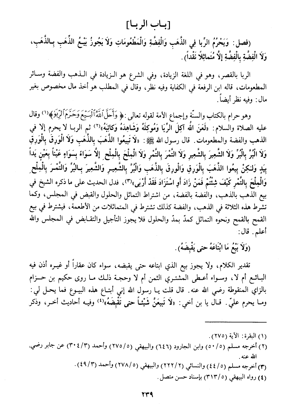 (لَا تَبِيعُوا الذَّهَب بِالذَّهَب وَلَا الْوَرق بالورق وَلَا الْبر بِالْبرِّ وَلَا الشّعير بِالشَّعِيرِ وَلَا التَّمْر بِالتَّمْرِ وَلَا الْملح بالملح إِلَّا سَوَاء بِسَوَاء عينا بِعَين يدا بيد وَلَكِن بيعوا الذَّهَب بالورق وَالْوَرق بِالذَّهَب وَالْبر بِالشَّعِيرِ وَالشعِير بِالْبرِّ وَالتَّمْر بالملح وَالْملح بِالتَّمْرِ كَيفَ شِئْتُم فَمن زَاد أَو اسْتَزَادَ فقد أربى) فَدلَّ الحَدِيث على مَا ذكره الشَّيْخ فِي بيع الذَّهَب بِالذَّهَب وَالْفِضَّة بِالْفِضَّةِ من اشْتِرَاط التَّمَاثُل والحلول وَالْقَبْض فِي الْمجْلس وكما تشرط هَذِه الثَّلَاثَة فِي الذَّهَب وَالْفِضَّة كَذَلِك تشْتَرط فِي المتماثلات من الْأَطْعِمَة فَيشْتَرط فِي بيع الْقَمْح بالقمح وَنَحْوه التَّمَاثُل كمد بِمد والحلول لَا يجوز التَّأْجِيل والتقابض فِي الْمجْلس وَالله أعلم قَالَ