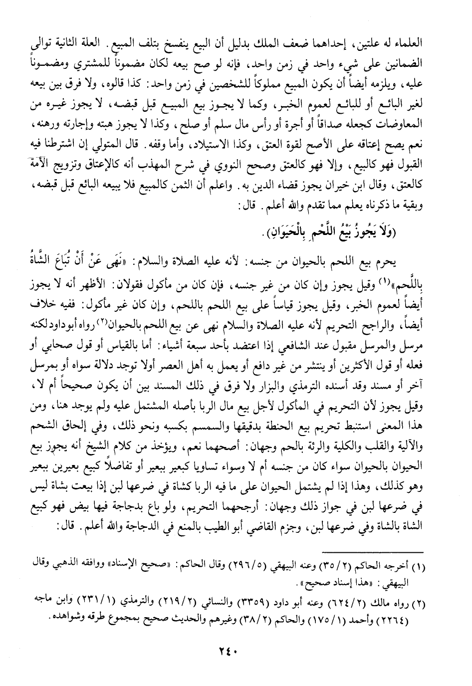 (نهى عَن أَن تبَاع الشَّاة بِاللَّحْمِ) وَقيل يجوز وَإِن كَانَ من غير جنسه فَإِن كَانَ من مَأْكُول فَقَوْلَانِ الْأَظْهر أَنه لَا يجوز أَيْضا لعُمُوم الْخَبَر وَقيل يجوز قِيَاسا على بيع اللَّحْم بِاللَّحْمِ وَإِن كَانَ غير مَأْكُول فَفِيهِ خلاف أَيْضا وَالرَّاجِح التَّحْرِيم لِأَنَّهُ عَلَيْهِ الصَّلَاة وَالسَّلَام نهي عَن بيع اللَّحْم بِالْحَيَوَانِ رَوَاهُ أَبُو دَاوُد لكنه مُرْسل والمرسل مَقْبُول عِنْد الشَّافِعِي إِذا اعتضد بِأحد سَبْعَة أَشْيَاء إِمَّا بِالْقِيَاسِ أَو قَول صَحَابِيّ أَو فعله أَو قَول الْأَكْثَرين أَو ينتشر من غير دَافع أَو يعْمل بِهِ أهل الْعَصْر أَولا تُوجد دلَالَة سواهُ أَو بمرسل آخر أَو مُسْند وَقد أسْندهُ التِّرْمِذِيّ وَالْبَزَّار وَلَا فرق فِي ذَلِك الْمسند بَين أَن يكون صَحِيحا أم لَا وَقيل يجوز لِأَن التَّحْرِيم فِي الْمَأْكُول لأجل بيع مَال الرِّبَا بِأَصْلِهِ الْمُشْتَمل عَلَيْهِ وَلم يُوجد هُنَا وَمن هَذَا الْمَعْنى استنبط تَحْرِيم بيع الْحِنْطَة بدقيقها والسمسم بِكَسْبِهِ وَنَحْو ذَلِك وَفِي إِلْحَاق الشَّحْم والآلية وَالْقلب والكلية والرئة بالحم وَجْهَان أصَحهمَا نعم وَيُؤْخَذ من كَلَام الشَّيْخ أَنه يجوز بيع الْحَيَوَان بِالْحَيَوَانِ سَوَاء كَانَ من جنسه أم لَا وَسَوَاء تَسَاويا كبعير بِبَعِير أَو تفاضلا كَبيع بَعِيرَيْنِ بِبَعِير وَهُوَ كَذَلِك وَهَذَا إِذا لم يشْتَمل الْحَيَوَان على مَا فِيهِ الرِّبَا كشاة فِي ضرْعهَا لبن إِذا بِيعَتْ بِشَاة لَيْسَ فِي ضرْعهَا لبن فِي جَوَاز ذَلِك وَجْهَان أرجحهما التَّحْرِيم وَلَو بَاعَ بدجاجة فِيهَا بيض فَهُوَ كَبيع الشَّاة بِالشَّاة وَفِي ضرْعهَا لبن وَجزم القَاضِي أَبُو الطّيب بِالْمَنْعِ فِي الدَّجَاجَة وَالله أعلم قَالَ