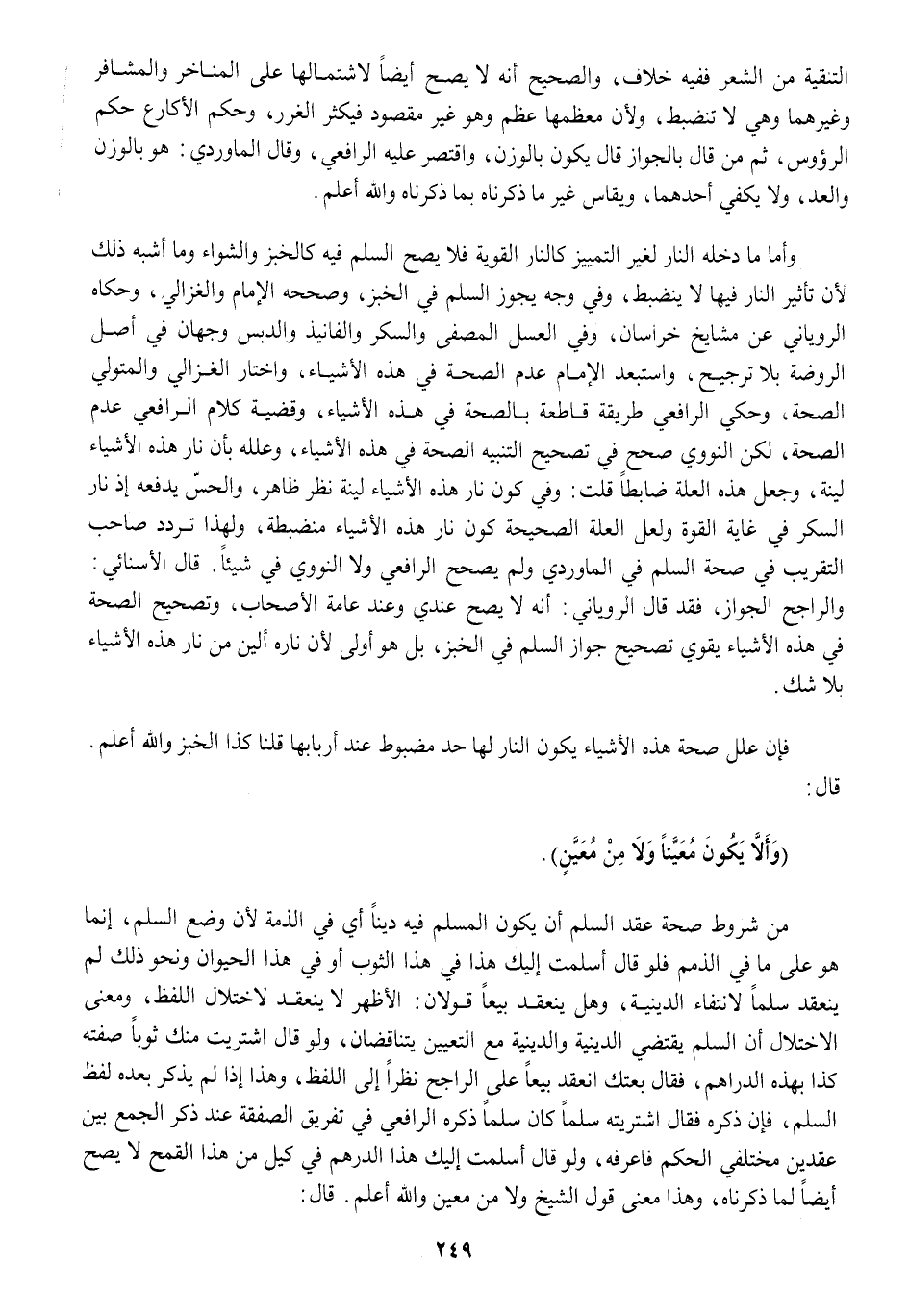 وَأما مَا دخله النَّار لغير التَّمْيِيز كالنار القوية فَلَا يَصح السّلم فِيهِ كالخبز والشواء وَمَا أشبه ذَلِك لِأَن تَأْثِير النَّار فِيهَا لَا يَنْضَبِط وَفِي وَجه يجوز السّلم فِي الْخبز وَصَححهُ الإِمَام وَالْغَزالِيّ وَحَكَاهُ الرَّوْيَانِيّ عَن مَشَايِخ خُرَاسَان وَفِي الْعَسَل الْمُصَفّى وَالسكر والفانيذ والدبس وَجْهَان فِي أصل الرَّوْضَة بِلَا تَرْجِيح واستبعد الإِمَام عدم الصِّحَّة فِي هَذِه الْأَشْيَاء وَاخْتَارَ الْغَزالِيّ وَالْمُتوَلِّيّ الصِّحَّة وَحكى الرَّافِعِيّ طَريقَة قَاطِعَة بِالصِّحَّةِ فِي هَذِه الْأَشْيَاء وَقَضِيَّة كَلَام الرَّافِعِيّ عدم الصِّحَّة لَكِن النَّوَوِيّ صحّح فِي تَصْحِيح التَّنْبِيه الصِّحَّة فِي هَذِه الْأَشْيَاء وَعلله بِأَن نَار هَذِه الْأَشْيَاء لينَة وَجعل هَذِه الْعلَّة ضابطاً قلت وَفِي كَون نَار هَذِه الْأَشْيَاء لينَة نظر ظَاهر والحس يَدْفَعهُ إِذْ نَار السكر فِي غَايَة الْقُوَّة وَلَعَلَّ الْعلَّة الصَّحِيحَة كَون نَار هَذِه الْأَشْيَاء منضبطة وَلِهَذَا تردد صَاحب التَّقْرِيب فِي صِحَة السّلم فِي المارودي وَلم يصحح الرَّافِعِيّ وَلَا النَّوَوِيّ فِي شَيْئا قَالَ الأسنائي وَالرَّاجِح الْجَوَاز فقد قَالَ الرَّوْيَانِيّ إِنَّه لَا يَصح عِنْدِي وَعند عَامَّة الْأَصْحَاب وَتَصْحِيح الصِّحَّة فِي هَذِه الْأَشْيَاء يُقَوي تَصْحِيح جَوَاز السّلم فِي الْخبز بل هُوَ أولى لِأَن ناره أَلين من نَار هَذِه الْأَشْيَاء بِلَا شكّ