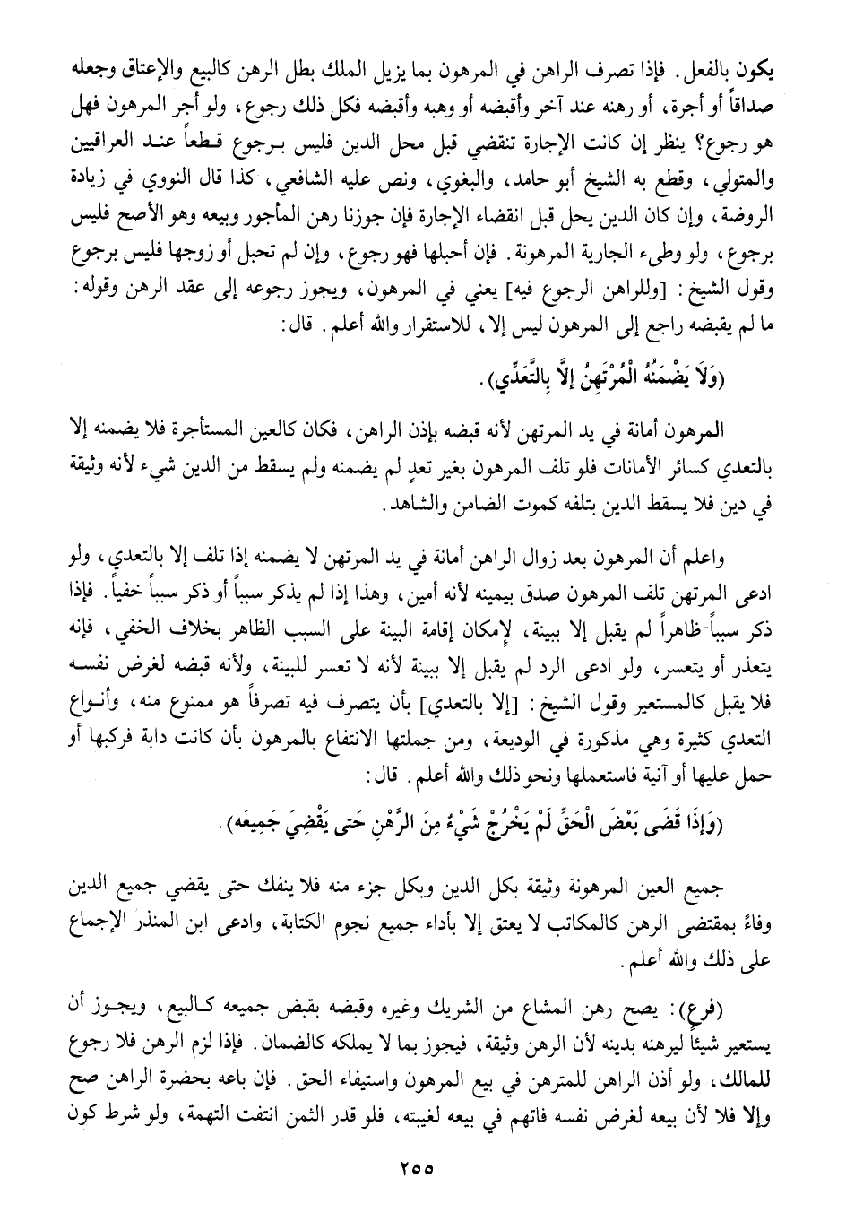 وَاعْلَم أَن الْمَرْهُون بعد زَوَال الرَّاهِن أَمَانَة فِي يَد الْمُرْتَهن لَا يضمنهُ إِذا تلف إِلَّا بِالتَّعَدِّي وَلَو ادّعى الْمُرْتَهن تلف الْمَرْهُون صدق بِيَمِينِهِ لِأَنَّهُ أَمِين وَهَذَا إِذا لم يذكر سَببا أَو ذكر سَببا خفِيا فَإِذا ذكر سَببا ظَاهرا لم يقبل إِلَّا بِبَيِّنَة لِإِمْكَان إِقَامَة الْبَيِّنَة على السَّبَب الظَّاهِر بِخِلَاف الْخَفي فَإِنَّهُ يتَعَذَّر أَو يتعسر وَلَو ادّعى الرَّد لم يقبل إِلَّا بِبَيِّنَة لِأَنَّهُ لَا تعسر للبينة وَلِأَنَّهُ قَبضه لغَرَض نَفسه فَلَا يقبل كالمستعير وَقَول الشَّيْخ إِلَّا بِالتَّعَدِّي بِأَن يتَصَرَّف فِيهِ تَصرفا هُوَ مَمْنُوع مِنْهُ وأنواع التَّعَدِّي كَثِيرَة وَهِي مَذْكُورَة فِي الْوَدِيعَة وَمن جُمْلَتهَا الِانْتِفَاع بالمرهون بِأَن كَانَت دَابَّة فركبها أَو حمل عَلَيْهَا أَو آنِية فاستعملها وَنَحْو ذَلِك وَالله أعلم قَالَ