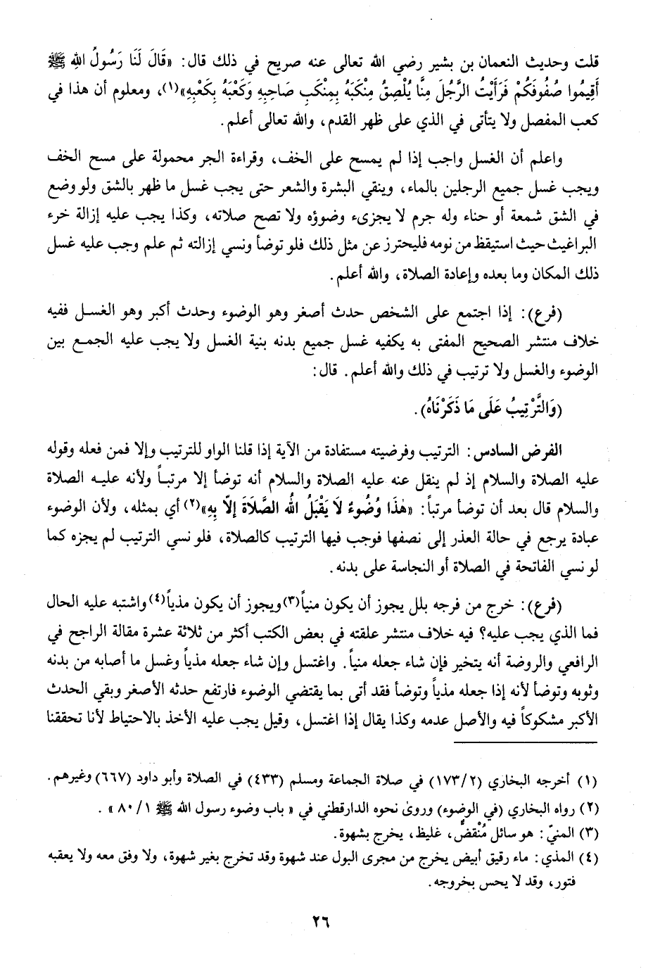 الْفَرْض السَّادِس التَّرْتِيب وفرضيته مستفادة من الْآيَة إِذا قُلْنَا الْوَاو للتَّرْتِيب وَإِلَّا فَمن فعله وَقَوله عَلَيْهِ الصَّلَاة وَالسَّلَام إِذْ لم ينْقل عَنهُ عَلَيْهِ الصَّلَاة وَالسَّلَام أَنه تَوَضَّأ إِلَّا مُرَتبا وَلِأَنَّهُ عَلَيْهِ الصَّلَاة وَالسَّلَام قَالَ بعد أَن تَوَضَّأ مُرَتبا