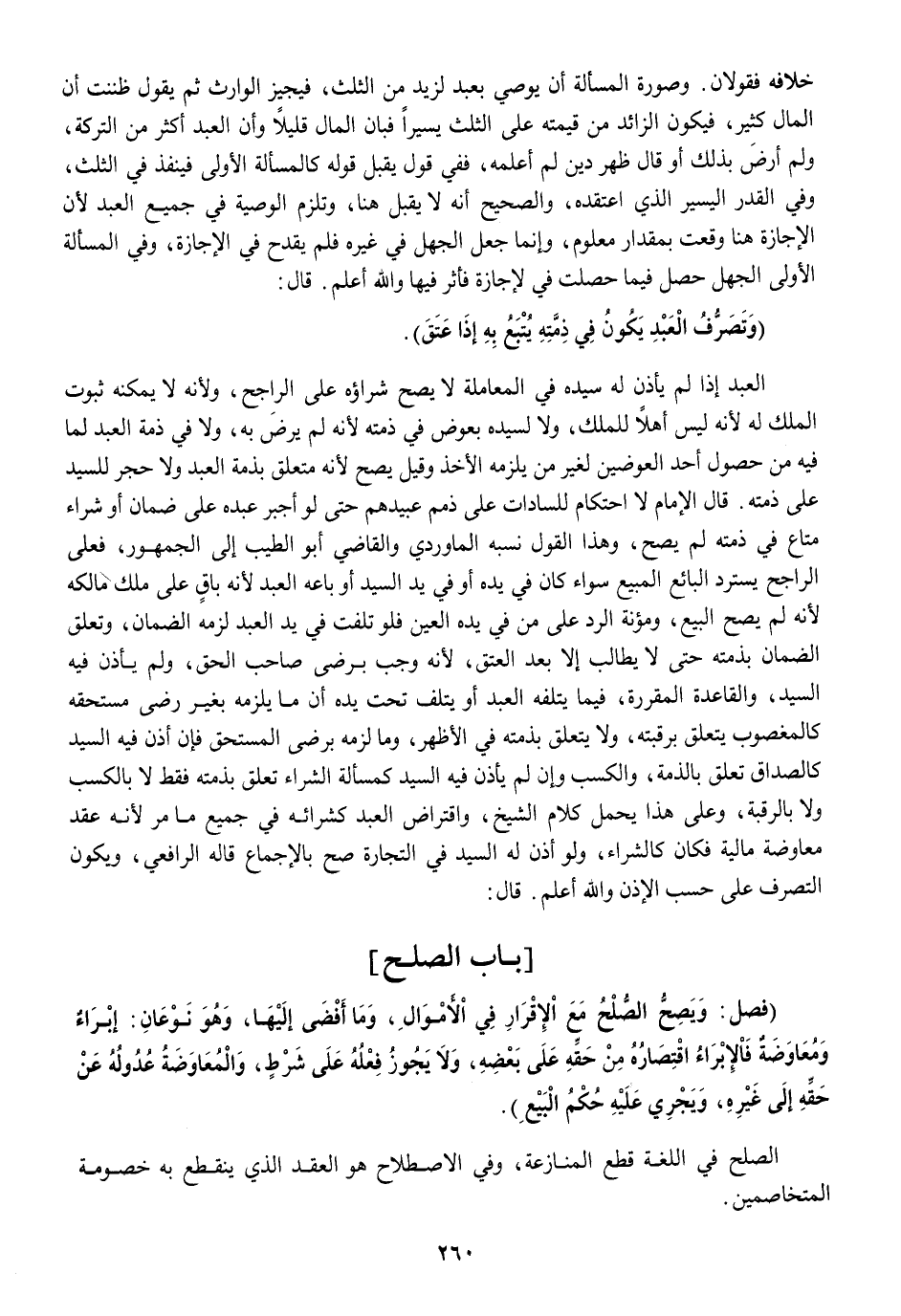 بَاب الصُّلْح فصل وَيصِح الصُّلْح مَعَ الْإِقْرَار فِي الْأَمْوَال وَمَا أفْضى إِلَيْهَا وَهُوَ نَوْعَانِ إِبْرَاء ومعاوضة فالإبراء اقْتِصَاره من حَقه على بعضه وَلَا يجوز على شَرط والمعاوضة عدوله عَن حَقه إِلَى غَيره وَيجْرِي عَلَيْهِ حكم البيع