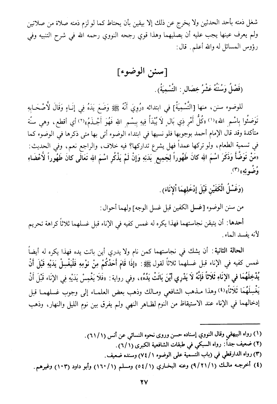 من سنَن الْوضُوء غسل الْكَفَّيْنِ قبل الْوَجْه وَلَهُمَا أَحْوَال