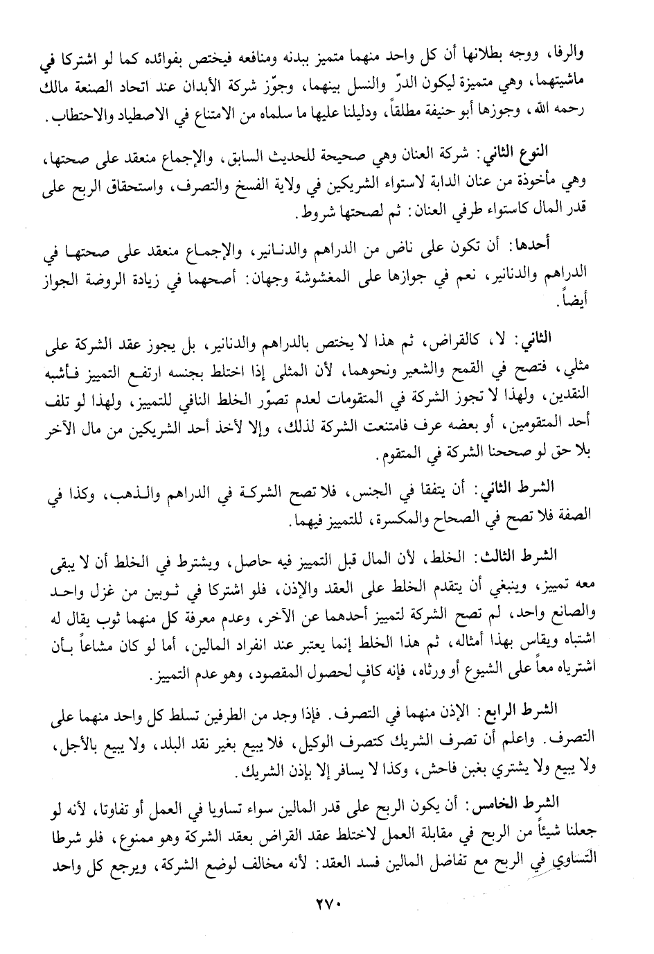 النَّوْع الثَّانِي شركَة الْعَنَان وَهِي صَحِيحَة للْحَدِيث السَّابِق وَالْإِجْمَاع مُنْعَقد على صِحَّتهَا وَهِي مَأْخُوذَة من عنان الدَّابَّة لِاسْتِوَاء الشَّرِيكَيْنِ فِي ولَايَة الْفَسْخ وَالتَّصَرُّف وَاسْتِحْقَاق الرِّبْح على قدر المَال كاستواء طرفِي الْعَنَان ثمَّ لصحتها شُرُوط