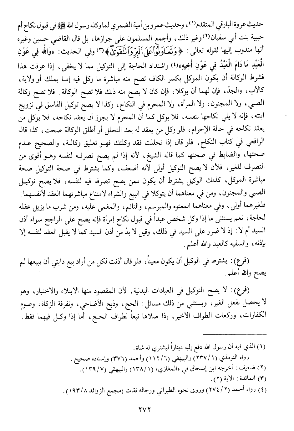 (وَالله فِي عون العَبْد مَا دَامَ العَبْد فِي عون أَخِيه) واشتداد الْحَاجة إِلَى التَّوْكِيل مِمَّا لَا يخفى إِذا عرفت هَذَا فَشرط الْوكَالَة أَن يكون الْمُوكل بِكَسْر الْكَاف تصح مِنْهُ مُبَاشرَة مَا وكل فِيهِ إِمَّا بِملك أَو ولَايَة كَالْأَبِ وَالْجد فَإِن لَهما أَن يوكلا فَإِن كَانَ لَا يَصح مِنْهُ ذَلِك فَلَا تصح الْوكَالَة فَلَا تصح وكَالَة الصَّبِي وَلَا الْمَجْنُون وَلَا الْمَرْأَة وَلَا الْمحرم فِي النِّكَاح وَكَذَا لَا يَصح تَوْكِيل الْفَاسِق فِي تَزْوِيج ابْنَته فَإِنَّهُ لَا يَلِي نِكَاحهَا بِنَفسِهِ فَلَا يُوكل كَمَا أَن الْمحرم لَا يجوز أَن يعْقد نِكَاحه فَلَا يُوكل من يعْقد نِكَاحه فِي حَالَة الْإِحْرَام فَلَو وكل من يعْقد لَهُ بعد التَّحَلُّل أَو أطلق الْوكَالَة صحت كَذَا قَالَه الرَّافِعِيّ فِي كتاب النِّكَاح فَلَو قَالَ إِذا تحللت فقد وَكلتك فَهُوَ تَعْلِيق وكَالَة وَالصَّحِيح عدم صِحَّتهَا وَالضَّابِط فِي صِحَّتهَا كَمَا قَالَه الشَّيْخ لِأَنَّهُ إِذا لم يَصح تصرفه لنَفسِهِ وَهُوَ أقوى من التَّصَرُّف للْغَيْر فَلِأَن لَا يَصح التَّوْكِيل أولى لِأَنَّهُ أَضْعَف وكما يشْتَرط فِي صِحَة التَّوْكِيل صِحَة مُبَاشرَة الْمُوكل كَذَلِك الْوَكِيل يشْتَرط أَن يكون مِمَّن يَصح تصرفه فِيهِ لنَفسِهِ فَلَا يَصح تَوْكِيل الصَّبِي وَالْمَجْنُون وَمن فِي مَعْنَاهُمَا أَن يتوكلا فِي البيع وَالشِّرَاء لِامْتِنَاع مباشرتهما العقد لأنفسهما فلغيرهما أولى وَفِي مَعْنَاهُمَا وَالْمَعْتُوه والمبرسم والنائم والمغمى عَلَيْهِ وَمن شرب مَا يزِيل عقله لحَاجَة نعم يسْتَثْنى مَا إِذا وكل شخص عبدا فِي قبُول نِكَاح امْرَأَة فَإِنَّهُ يَصح على الرَّاجِح سَوَاء أذن السَّيِّد أم لَا إِذْ لَا ضَرَر على السَّيِّد فِي ذَلِك وَقيل لَا بُد من إِذن السَّيِّد كَمَا لَا يقبل العقد لنَفسِهِ إِلَّا بِإِذْنِهِ وَالسَّفِيه كَالْعَبْدِ وَالله أعلم