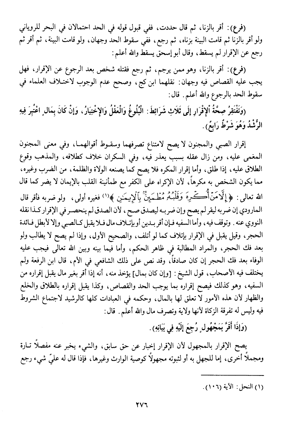 إِقْرَار الصَّبِي وَالْمَجْنُون لَا يَصح لِامْتِنَاع تصرفهما وَسُقُوط أقوالهما وَفِي معنى الْمَجْنُون الْمغمى عَلَيْهِ وَمن زَالَ عقله بِسَبَب يعْذر فِيهِ وَفِي السَّكْرَان خلاف كطلاقه وَالْمذهب وُقُوع الطَّلَاق عَلَيْهِ إِذا طلق وَأما الْإِقْرَار الْمُكْره فَلَا يَصح كَمَا يصنعه الْوُلَاة والظلمة من الضَّرْب وَغَيره مِمَّا يكون الشَّخْص بِهِ مكْرها لِأَن الْإِكْرَاه على الْكفْر مَعَ طمأنينة الْقلب بِالْإِيمَان لَا يضر كَمَا قَالَ الله تَعَالَى {إِلَّا مَنْ أُكْرِهَ وَقَلْبُهُ مُطْمَئِنٌّ بِالْأِيمَانِ} فَغَيره أولى وَلَو ضربه فَأقر قَالَ الْمَاوَرْدِيّ إِن ضربه لِيُقِر لم يَصح وَإِن ضربه ليصدق صَحَّ لِأَن الصدْق لم ينْحَصر فِي الْإِقْرَار كَذَا نَقله النَّوَوِيّ عَنهُ وَتوقف فِيهِ وَأما السَّفِيه فَإِن أقرّ بدين أَو بِإِتْلَاف مَال فَلَا يقبل كَالصَّبِيِّ وَإِلَّا لأبطل فَائِدَة الْحجر وَقيل يقبل فِي الْإِقْرَار بِإِتْلَاف كَمَا لَو أتلف وَالصَّحِيح الأول وَإِذا لم يَصح لَا يُطَالب وَلَو بعد فك الْحجر وَالْمرَاد الْمُطَالبَة فِي ظَاهر الحكم وَأما فِيمَا بَينه وَبَين الله تَعَالَى فَيجب عَلَيْهِ الْوَفَاء بعد فك الْحجر إِن كَانَ صَادِقا وَقد نَص على ذَلِك الشَّافِعِي فِي الْأُم قَالَ ابْن الرّفْعَة وَلم يخْتَلف فِيهِ الْأَصْحَاب قَول الشَّيْخ وَإِن كَانَ بِمَال يُؤْخَذ مِنْهُ أَنه إِذا أقرّ بِغَيْر مَال يقبل إِقْرَاره من السَّفِيه وَهُوَ كَذَلِك فَيصح إِقْرَاره بِمَا يُوجب الْحَد وَالْقصاص وَكَذَا يقبل إِقْرَاره بِالطَّلَاق وَالْخلْع وَالظِّهَار لِأَن هَذِه الْأُمُور لَا تعلق لَهَا بِالْمَالِ وَحكمه فِي الْعِبَادَات كلهَا كالرشيد لِاجْتِمَاع الشُّرُوط فِيهِ وَلَيْسَ لَهُ تَفْرِقَة الزَّكَاة لِأَنَّهُ ولَايَة وَتصرف مَال وَالله أعلم قَالَ