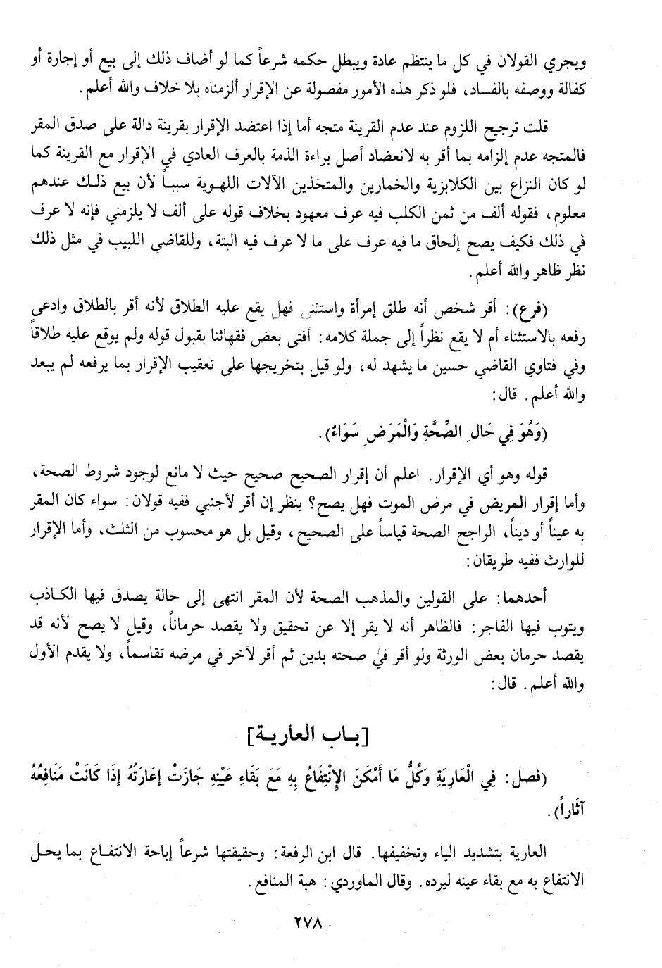 بَاب الْعَارِية فصل فِي الْعَارِية وكل مَا أمكن الِانْتِفَاع بِهِ مَعَ بَقَاء عينه جَازَت إعارته إِذا كَانَت مَنَافِعه آثاراً