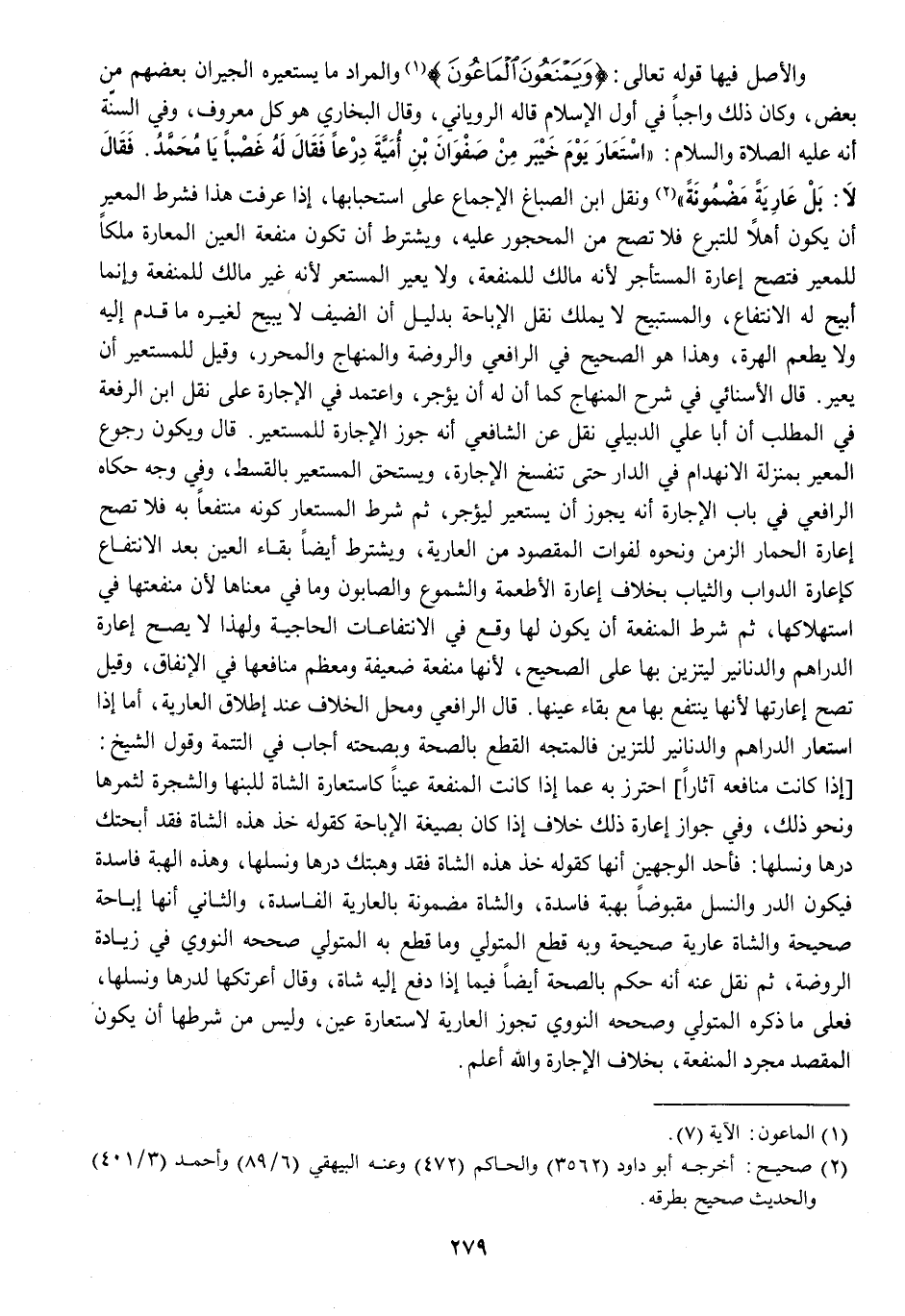 (اسْتعَار يَوْم خَيْبَر من صَفْوَان بن أُميَّة درعاً فَقَالَ لَهُ غصبا يَا مُحَمَّد فَقَالَ لَا بل عَارِية مَضْمُونَة) وَنقل ابْن الصّباغ الْإِجْمَاع على استحبابها إِذا عرفت هَذَا فَشرط الْمُعير أَن يكون أَهلا للتبرع فَلَا تصح من الْمَحْجُور عَلَيْهِ وَيشْتَرط أَن تكون مَنْفَعَة الْعين المعارة ملكا للْمُعِير فَتَصِح إِعَارَة الْمُسْتَأْجر لِأَنَّهُ ملك للمنفعة وَلَا يعير الْمُسْتَعِير لِأَنَّهُ غير مَالك للمنفعة وَإِنَّمَا أُبِيح لَهُ الِانْتِفَاع والمستبيح لَا يملك نقل الْإِبَاحَة بِدَلِيل أَن الضَّيْف لَا يُبِيح لغيره مَا قدم إِلَيْهِ وَلَا يطعم الْهِرَّة وَهَذَا هُوَ الصَّحِيح فِي الرَّافِعِيّ وَالرَّوْضَة والمنهاج وَالْمُحَرر وَقيل للْمُسْتَعِير أَن يعير قَالَ الإسنائي فِي شرح الْمِنْهَاج كَمَا أَن لَهُ أَن يُؤجر وَاعْتمد فِي الْإِجَارَة على نقل ابْن الرّفْعَة فِي الْمطلب أَن أَبَا عَليّ الدبيلي نقل عَن الشَّافِعِي أَنه جوز الْإِجَارَة للْمُسْتَعِير قَالَ وَيكون رُجُوع الْمُعير بِمَنْزِلَة الإنهدام فِي الدَّار حَتَّى تَنْفَسِخ الْإِجَارَة وَيسْتَحق الْمُسْتَعِير بِالْقِسْطِ وَفِي وَجه حَكَاهُ الرَّافِعِيّ فِي بَاب الْإِجَارَة أَنه يجوز أَن يستعير ليؤجر ثمَّ شَرط الْمُسْتَعَار كَونه مُنْتَفعا بِهِ فَلَا تصح إِعَارَة الْحمار الزَّمن وَنَحْوه لفَوَات الْمَقْصُود من الْعَارِية وَيشْتَرط أَيْضا بَقَاء الْعين بعد الِانْتِفَاع كإعارة الدَّوَابّ وَالثيَاب بِخِلَاف إِعَارَة الْأَطْعِمَة والشموع والصابون وَمَا فِي مَعْنَاهَا لِأَن مَنْفَعَتهَا فِي استهلاكها ثمَّ شَرط الْمَنْفَعَة أَن يكون لَهَا وَقع فِي الانتفاعات الحاجية وَلِهَذَا لَا يَصح اعارة الدَّرَاهِم وَالدَّنَانِير ليتزين بهَا على الصَّحِيح لِأَنَّهَا مَنْفَعَة ضَعِيفَة ومعظم مَنَافِعهَا فِي الانفاق وَقيل تصح إعارتها لِأَنَّهَا ينْتَفع بهَا مَعَ بَقَاء عينهَا قَالَ الرَّافِعِيّ وَمحل الْخلاف عِنْد إِطْلَاق الْعَارِية أما إِذا اسْتعَار الدَّرَاهِم وَالدَّنَانِير للتزين فَالْمُتَّجه الْقطع بِالصِّحَّةِ وبصحته أجَاب فِي التَّتِمَّة وَقَول الشَّيْخ إِذا كَانَت مَنَافِعه آثاراً احْتَرز بِهِ عَمَّا إِذا كَانَت الْمَنْفَعَة عينا كاستعارة الشَّاة للبنها والشجرة لثمرها وَنَحْو ذَلِك وَفِي جَوَاز إِعَارَة ذَلِك خلاف إِذا كَانَ بِصِيغَة الْإِبَاحَة كَقَوْلِه خُذ هَذِه الشَّاة فقد أبحتك درها ونسلها فأحد الْوَجْهَيْنِ أَنَّهَا كَقَوْلِه خُذ هَذِه الشَّاة فقد وَهبتك درها ونسلها وَهَذِه الْهِبَة فَاسِدَة فَيكون الدّرّ والنسل مَقْبُوضا بِهِبَة فَاسِدَة وَالشَّاة مَضْمُونَة بالعارية الْفَاسِدَة وَالثَّانِي أَنَّهَا إِبَاحَة صَحِيحَة وَالشَّاة عَارِية صَحِيحَة وَبِه قطع الْمُتَوَلِي وَمَا قطع بِهِ الْمُتَوَلِي صَححهُ النَّوَوِيّ فِي زِيَادَة الرَّوْضَة ثمَّ نقل عَنهُ أَنه حكم بِالصِّحَّةِ أَيْضا فِيمَا إِذا دفع إِلَيْهِ شَاة وَقَالَ أعرتكها لدرها ونسلها فعلى مَا ذكره الْمُتَوَلِي وَصَححهُ النَّوَوِيّ تجوز الْعَارِية لاستعارة عين وَلَيْسَ من شَرطهَا أَن يكون الْمَقْصد مُجَرّد الْمَنْفَعَة بِخِلَاف الْإِجَارَة وَالله أعلم