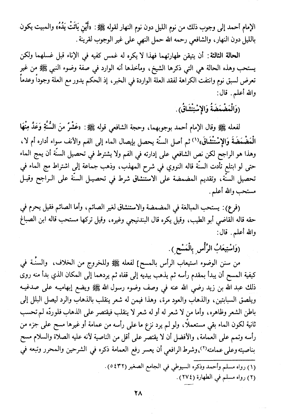 من سنَن الْوضُوء اسْتِيعَاب الرَّأْس بِالْمَسْحِ لفعله صلى الله عَلَيْهِ وَسلم وللخروج من الْخلاف وَالسّنة فِي كَيْفيَّة الْمسْح أَن يبْدَأ بِمقدم رَأسه ثمَّ يذهب بيدَيْهِ إِلَى قَفاهُ ثمَّ يردهما إِلَى الْمَكَان الَّذِي بَدَأَ مِنْهُ روى ذَلِك عبد الله بن زيد رَضِي الله عَنهُ فِي وصف وضوء رَسُول الله صلى الله عَلَيْهِ وَسلم وَيَضَع إبهاميه على صدغيه ويلصق السبابتين والذهاب وَالْعود مرّة وَهَذَا فِيمَن لَهُ شعر يَنْقَلِب بالذهاب وَالرَّدّ ليصل البلل إِلَى بَاطِن الشّعْر وَظَاهره وَأما من لَا شعر لَهُ أَو لَهُ شعر لَا يَنْقَلِب فَيقْتَصر على الذّهاب فَلَو رده لم تحسب ثَانِيَة لكَون المَاء بَقِي مُسْتَعْملا وَلَو لم يرد نزع مَا على رَأسه من عِمَامَة أَو غَيرهَا مسح على جُزْء من رَأسه وتمم على الْعِمَامَة وَالْأَفْضَل أَن لَا يقْتَصر على أقل من الناصية لِأَنَّهُ عَلَيْهِ الصَّلَاة وَالسَّلَام مسح بناصيته وعَلى عمَامَته وَشرط الرَّافِعِيّ أَن يعسر رفع الْعِمَامَة ذكره فِي الشرحين وَالْمُحَرر وَتَبعهُ فِي