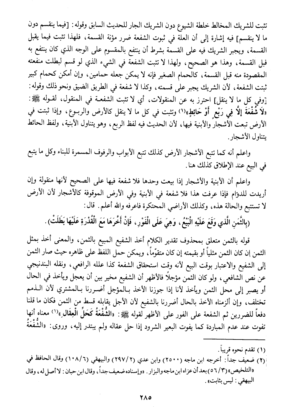 (لَا شُفْعَة إِلَّا فِي ربع أَو حَائِط) وَتثبت فِي كل مَالا ينْقل كالأرض والربوع وَإِذا ثبتَتْ فِي الأَرْض تبِعت الْأَشْجَار والأبنية فِيهَا لِأَن الحَدِيث فِيهِ لفظ الرّبع وَهُوَ يتَنَاوَل الْأَبْنِيَة وَلَفظ الْحَائِط يتَنَاوَل الْأَشْجَار